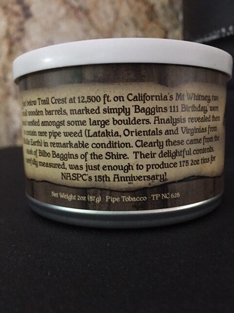 2oz tin, blended by GL Pease exclusively for the 2012 NASPC Pipe and Tobacco Show and commemorating the 15th Anniversary of club tobaccos. Middle Earth themed. Reputedly a pipe weed "from the stash of Bilbo Baggins of the Shire."