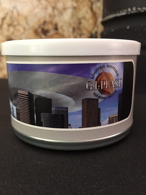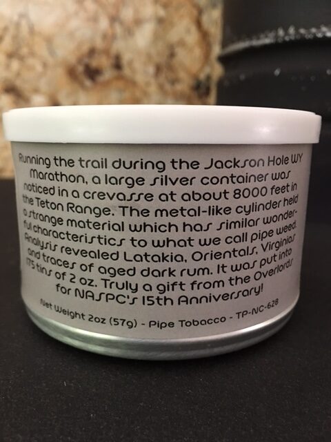 2oz tin, blended by GL Pease exclusively for the 2012 NASPC Pipe and Tobacco Show and commemorating the 15th Anniversary of club tobaccos. Sci-Fi themed. Reputedly an out of this world pipe weed. "Truly a gift from the Overlords..."