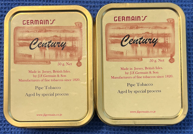 2 unopened tins of Germain's Century tobacco. I acquired these in March & September of 2018, so they have a t least 5 years of age on them. Always stored in my climate-controlled tobacco cellar. 5 day listing no reserve, or buy it now.