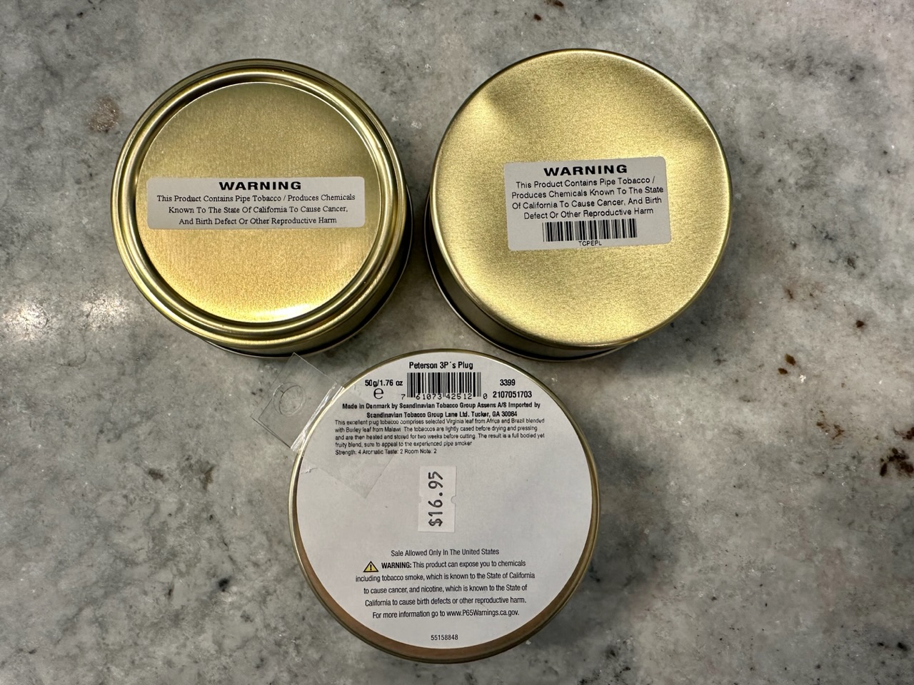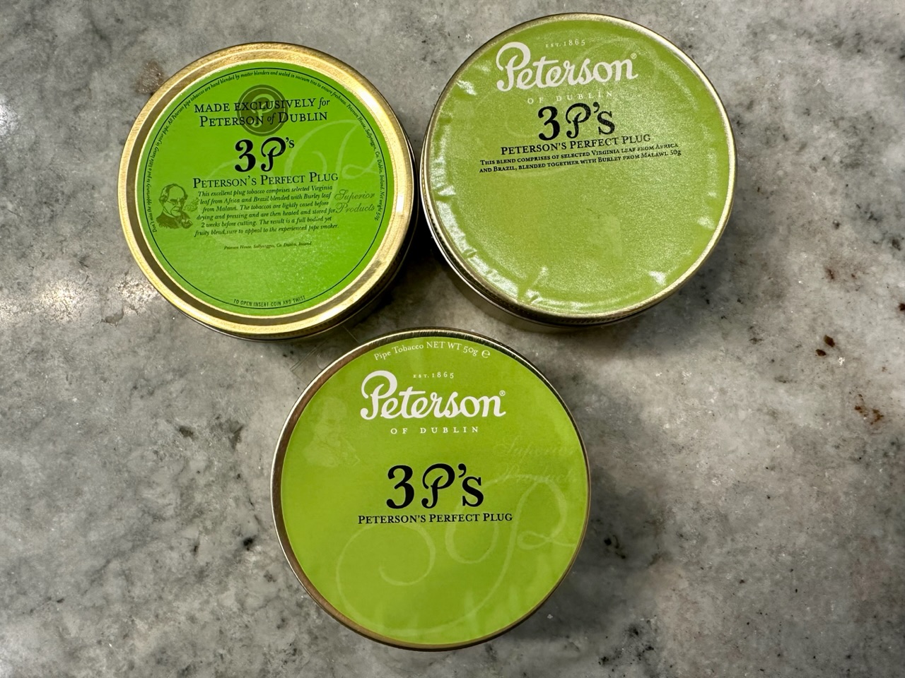This 7-day auction is for three sealed 50g tins of aged Peterson’s Perfect Plug (3P’s).