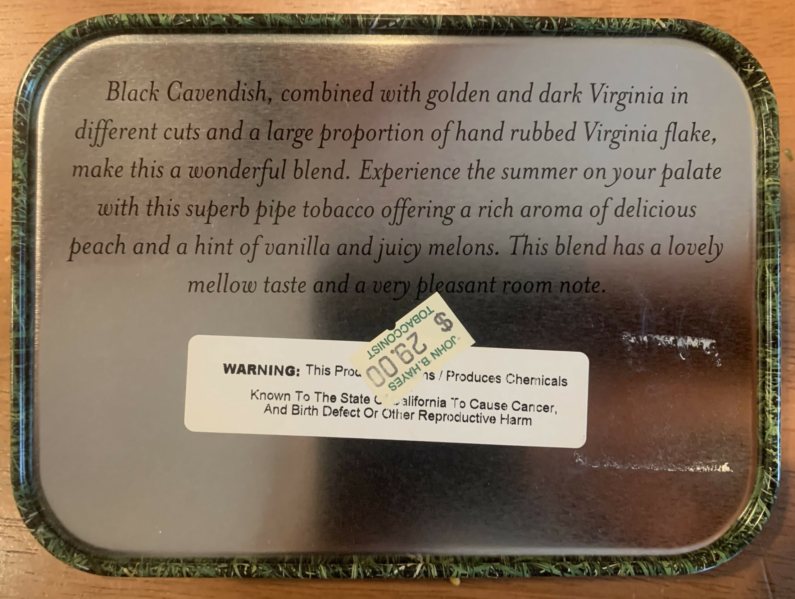 "Black Cavendish, combined with golden and dark Virginia in different cuts and a large proportion of hand rubbed Virginia flake, make this a wonderful blend. Experience the summer on your palate with this superb pipe tobacco offering a rich aroma of delicious peach and a hint of vanilla and juicy melons. This blend has a lovely mellow taste and a very pleasant room note."