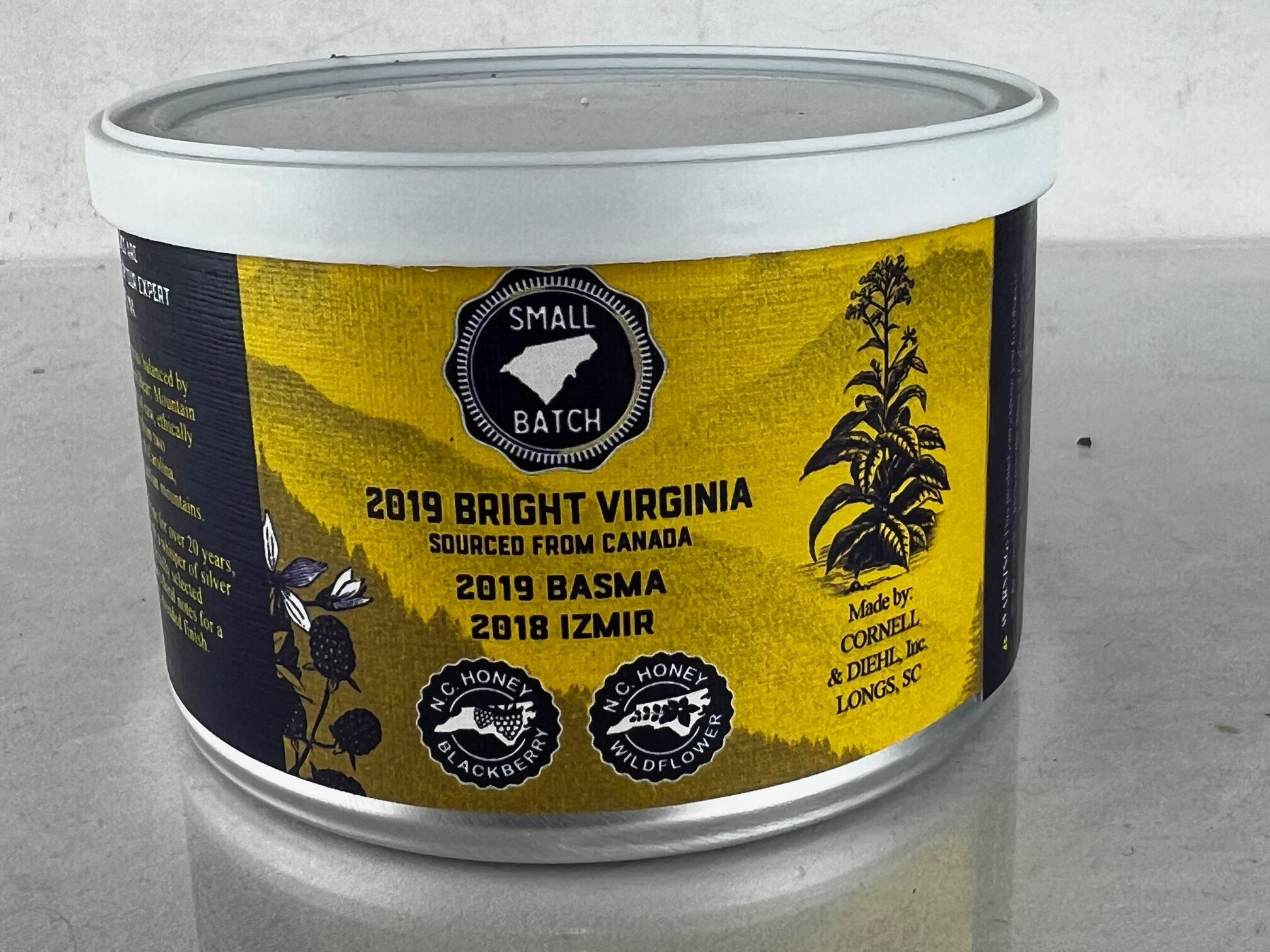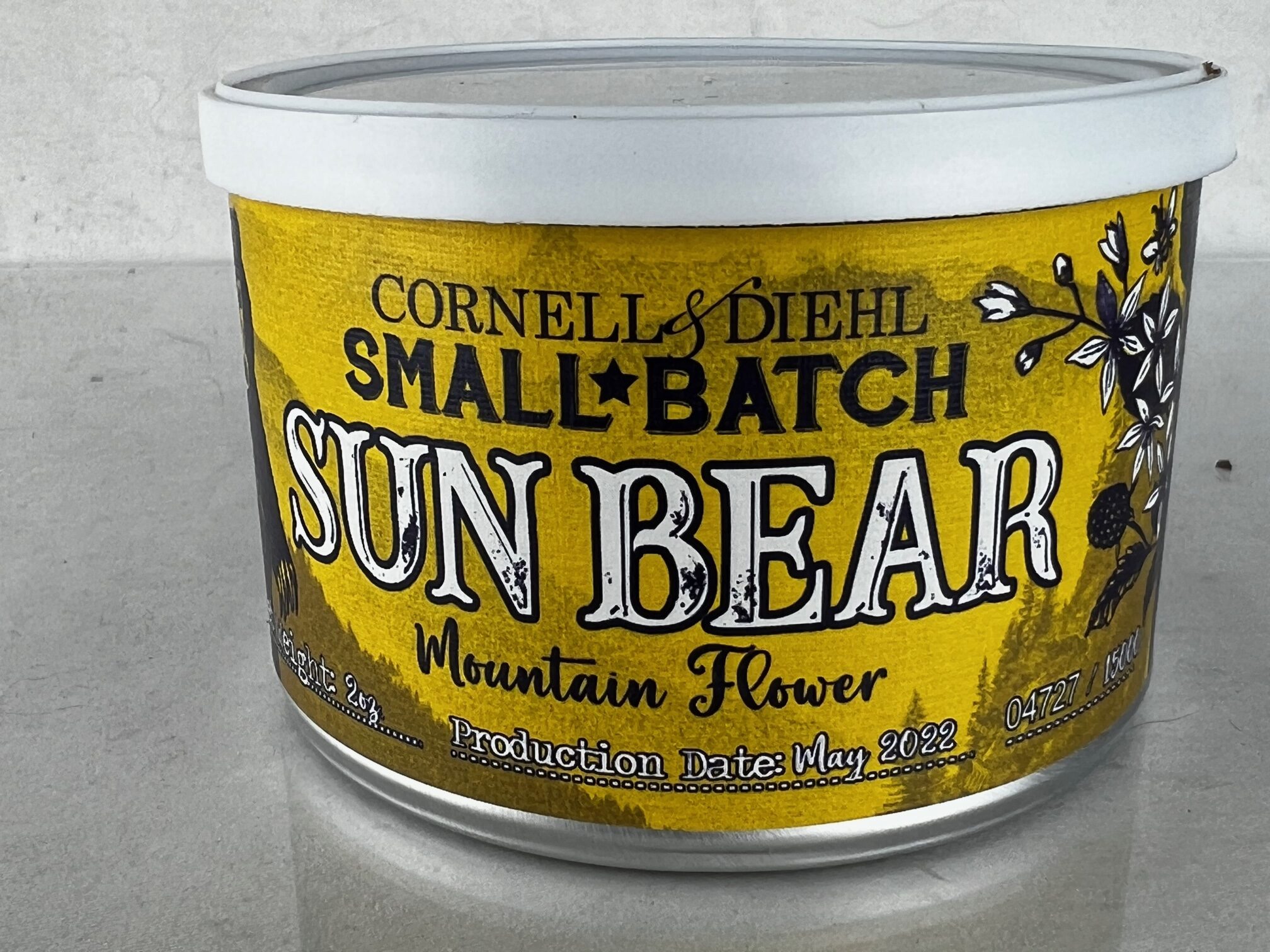 Sun Bear Mountain Flower 2022 - C&D 2 oz - an Oriental. Per TobaccoReviews: " top-tier Bright Virginias with two distinct varietals of matured Oriental leaf. Natural casings of silver tequila and elderflower complement these tobaccos, alongside a drizzle of raw, unpasteurized honey to elevate the leaf's inherent sweetness and floral notes. While previous iterations have featured honey from various farms, including the personal hives of C&D's head blender Jeremy Reeves, 2022's edition further augments the blend with ethically sourced wildflower and blackberry honey from a family-owned apiary in Morganton, NC — a community that Cornell & Diehl called home for over 20 years."