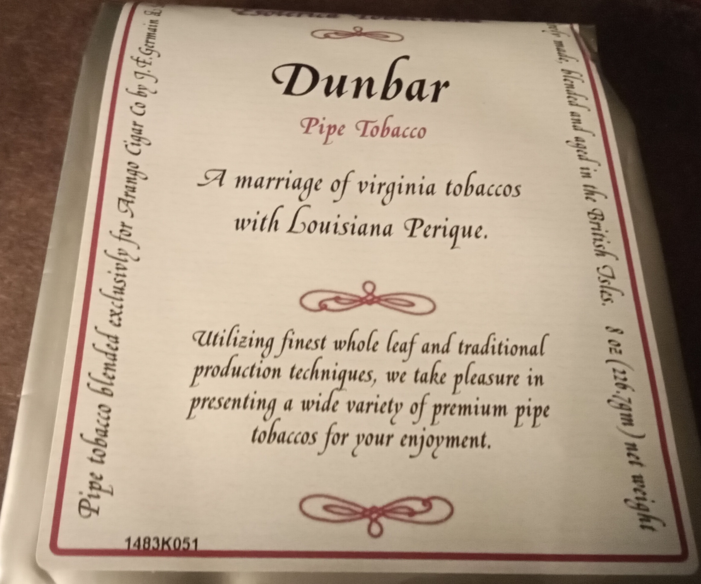 You are bidding on an 8 ounce no problem bag of Esoterica Dunbar. How much more Perique does Germain have? I don’t know, but I do know that the only other United Kingdom manufacturer, Gawith Hoggarth, has none.