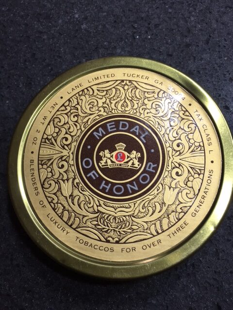 A vintage 2oz tin of Medal of Honor from Lane Limited. Date on back of January 2002. Peppered with tiny dents, this tin has been around. Solid seal. No shake.