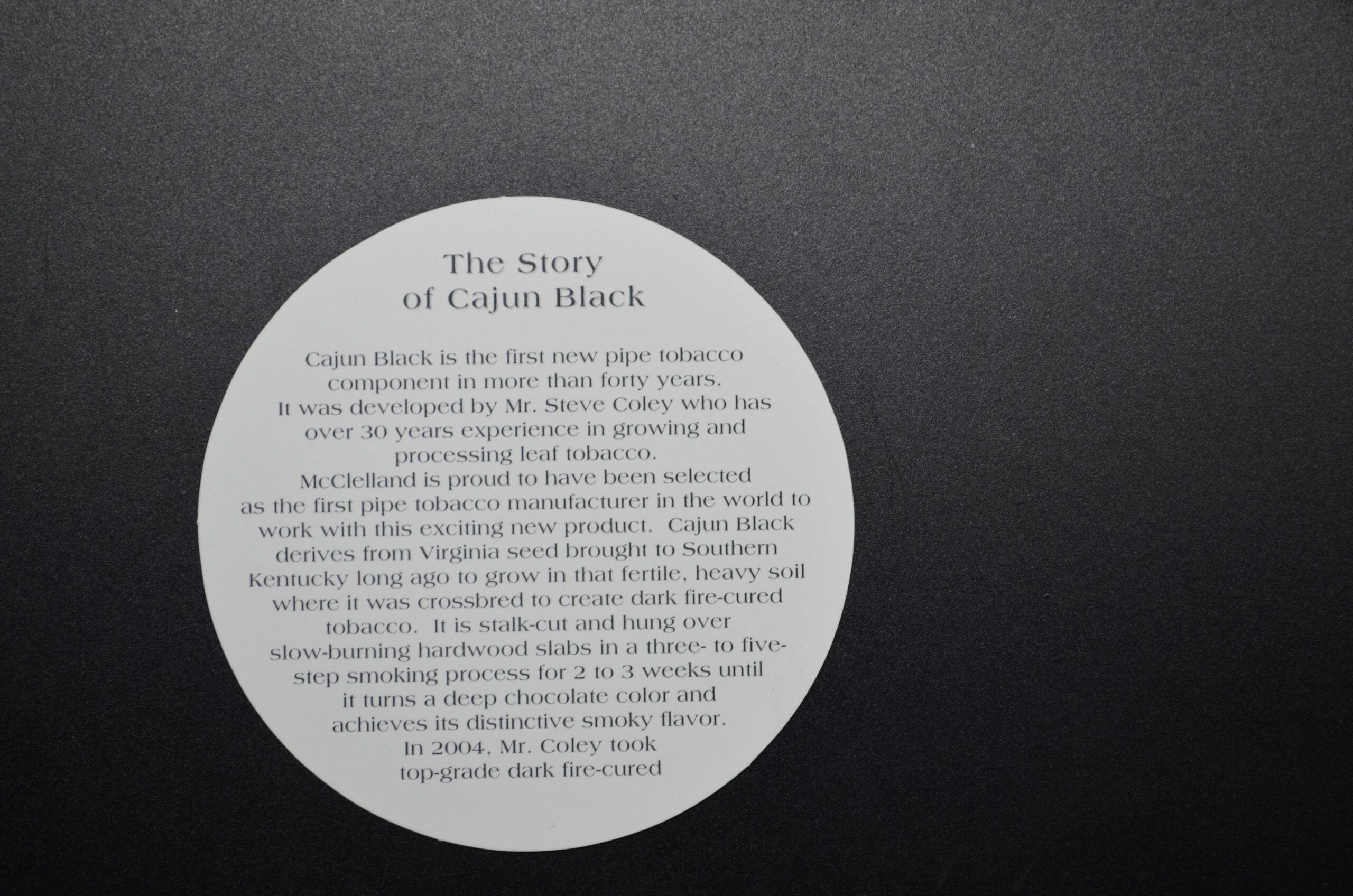 Notes: Cajun Black is the first new pipe tobacco component in more than forty years. Cajun Black derives from Virginia seed brought to southern Kentucky long ago to grow in that fertile, heavy soil where it was crossbred to create dark fire-cured tobacco. It is stalk-cut and hung over slow-burning hardwood slabs in a three to five step smoking process until it turns a deep chocolate color and achieves its distinctive smoky flavor.