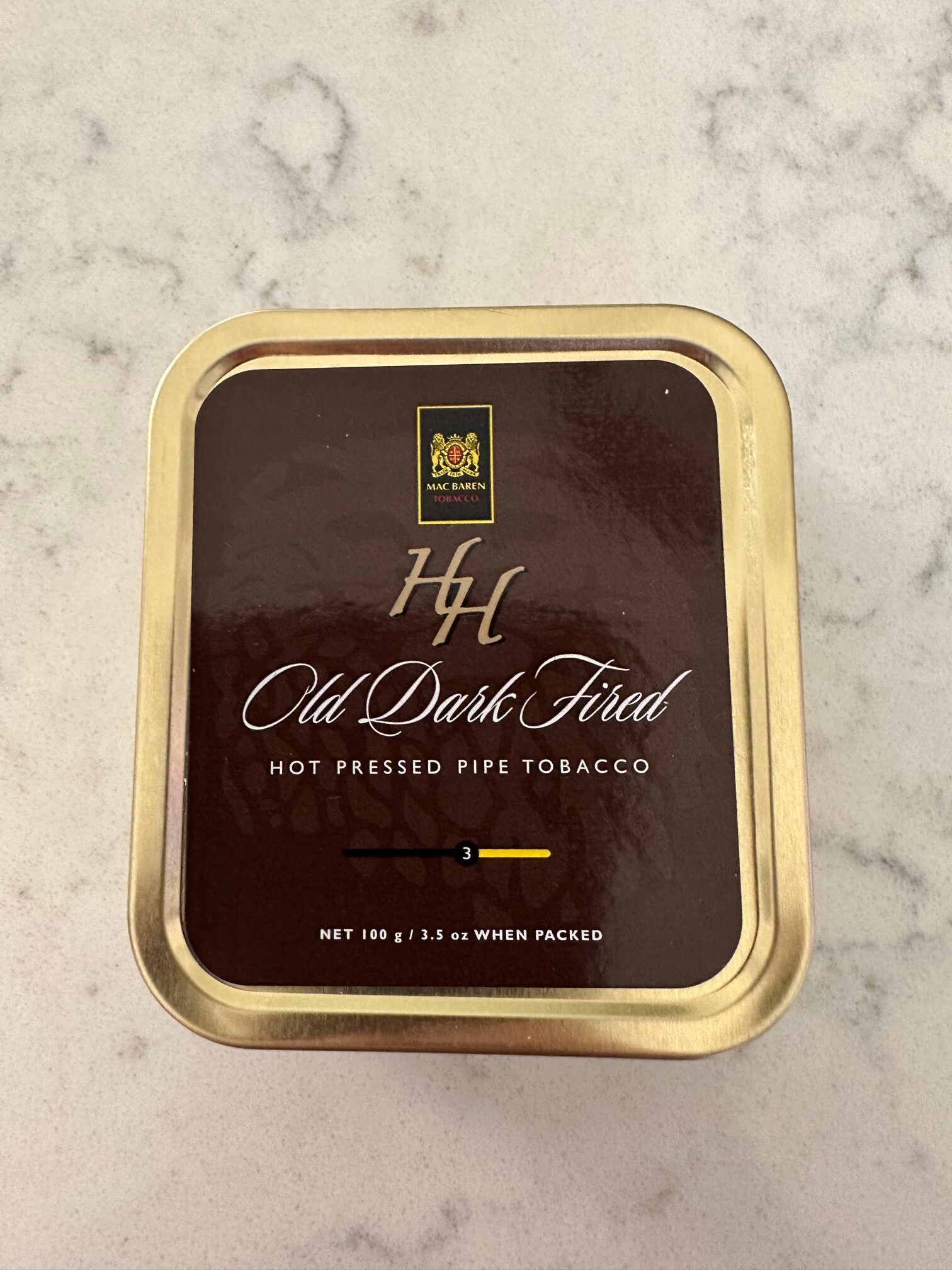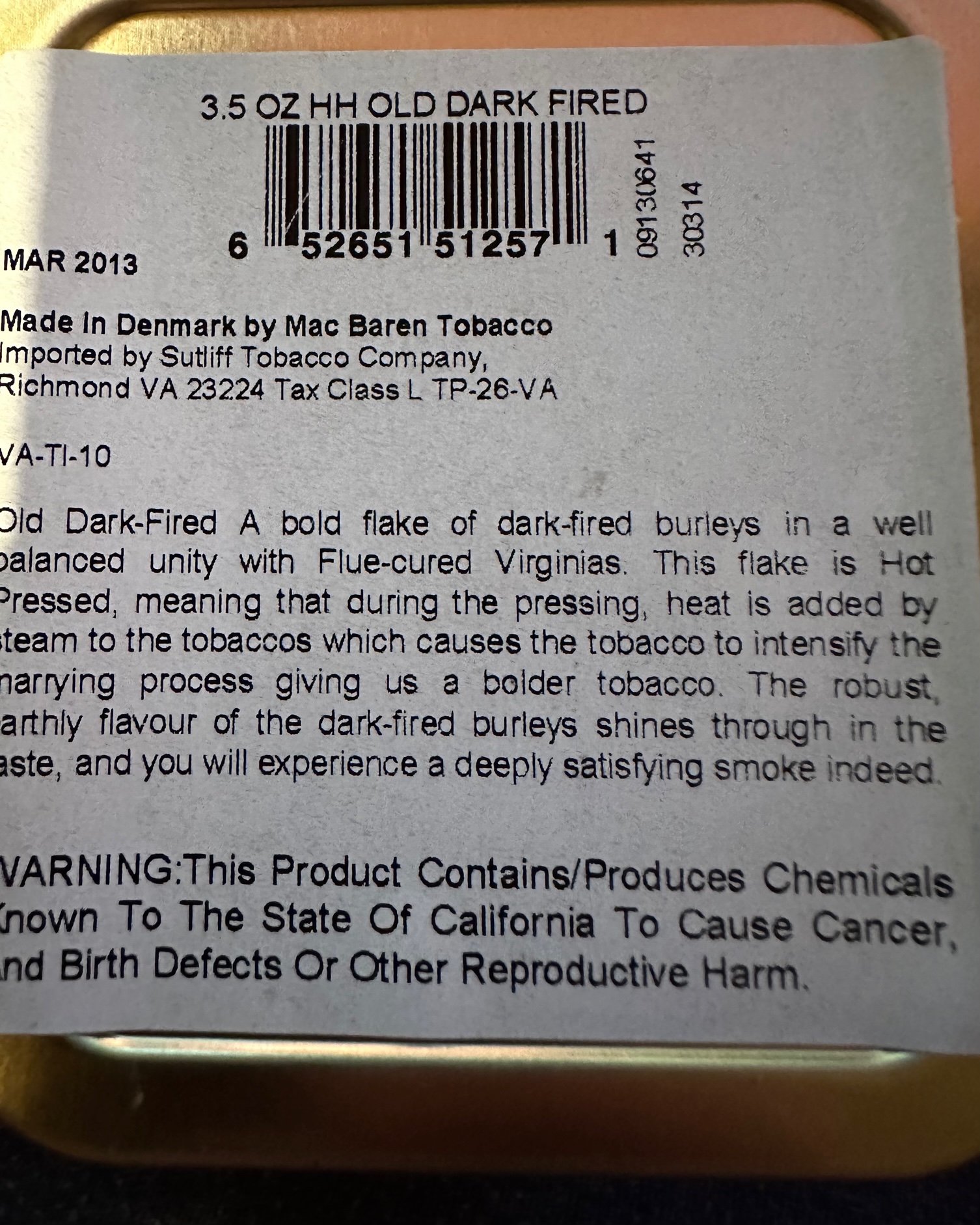 A vintage tin of old dark fired from Macbaren purchased in 2013 so 10 years of age on this tin. From tobacco reviews: A bold flake of dark-fired burleys in a well balanced unity with flue cured Virginias. This flake is hot pressed, meaning that during the pressing, heat is added by steam to the tobaccos which causes the tobacco to intensify the marrying process giving us a bolder tobacco. The robust, earthly flavour of the dark-fired burleys shines through in the taste, and you will experience a deeply satisfying smoke indeed.