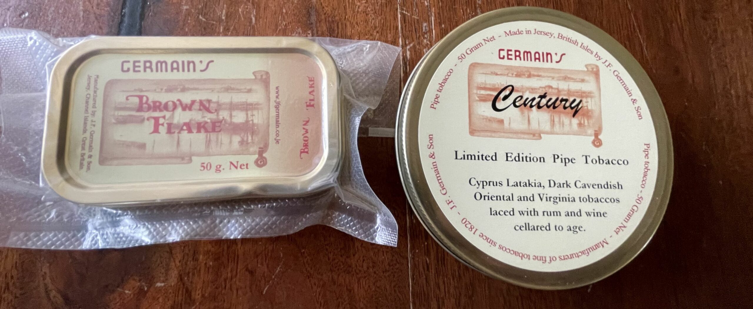 2020 Germain's Century limited edition and a well-aged tin of Brown flake. Both are vacuum sealed.
