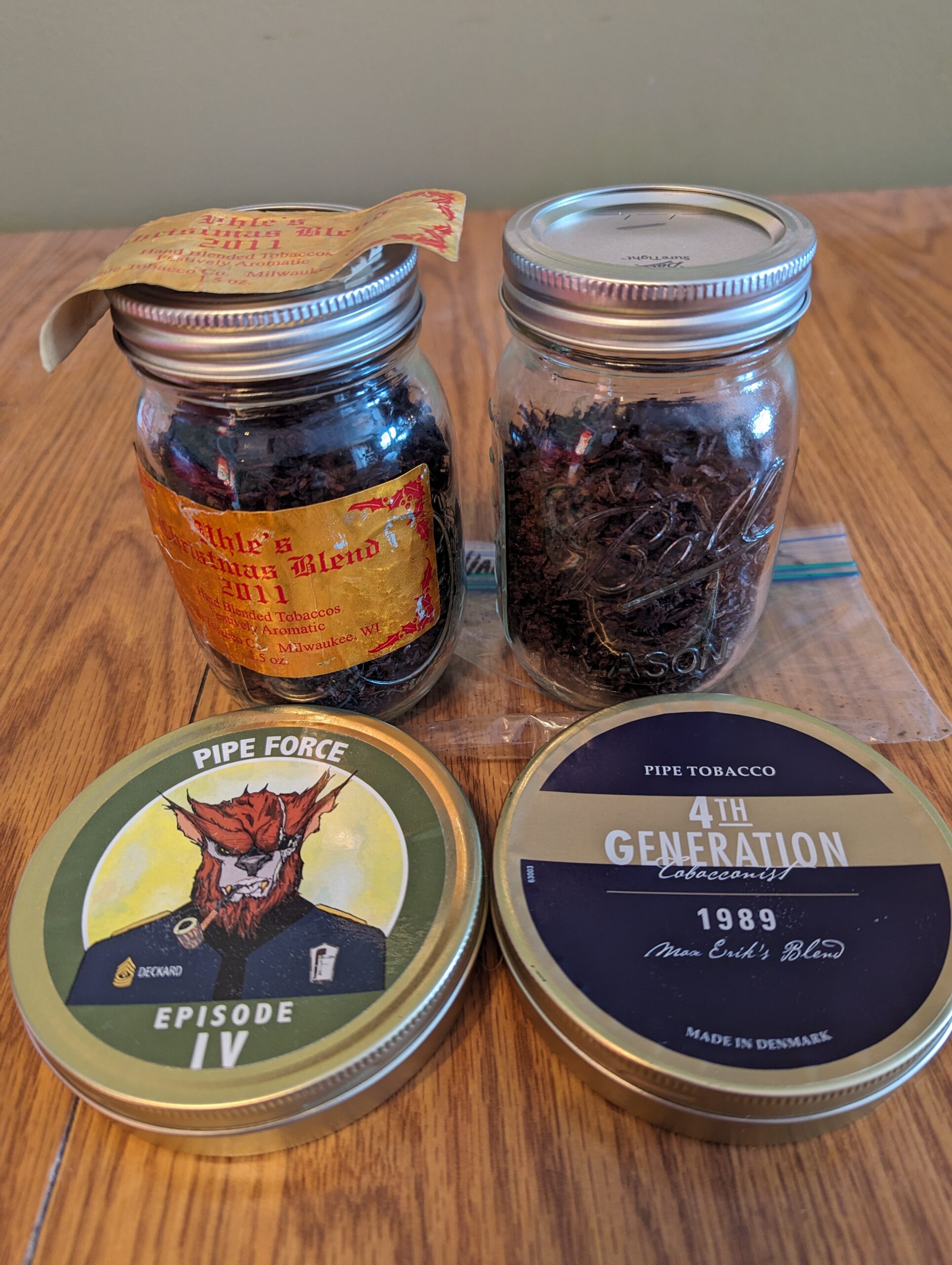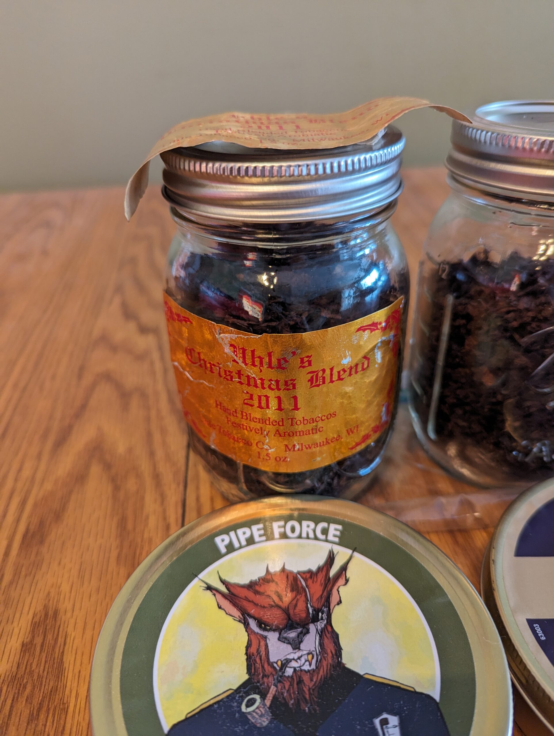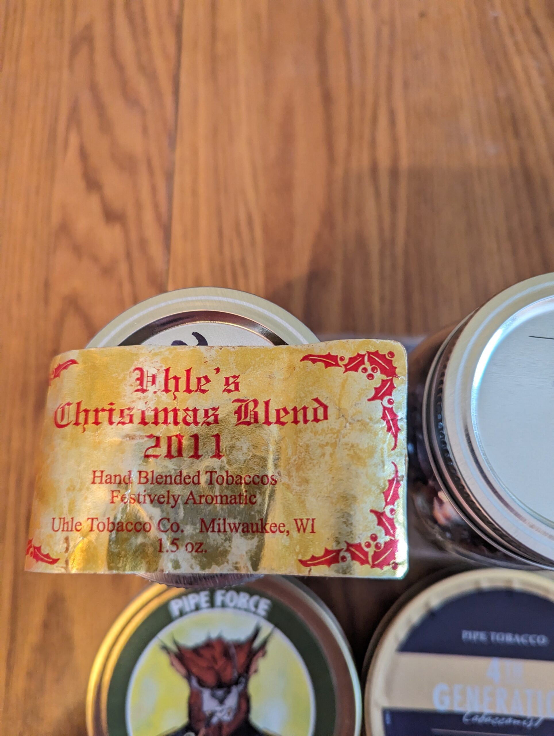 This is a REAL TREAT. You are bidding on 2.66 oz of UHLE'S Christmas Blend from 2011, loose in glass jar, smells super and I will include 2 original labels when bought. NOT DRY, very nice condition, You will also bid on 2.17 ounces of McClelland JUST PLAIN NUT loose in sealed jar. not sure of age of this one but it's got to be older. Then you are also bidding on a sealed tin of 4th Generation 1989 Max Erik's blend, and then 1 sealed tin of pipe force episode IV. Tins are all sealed, I will ship tobacco in plastic bags instead of the glass jars for safety and you will get the 2 original labels with the UHLE's Christmas Blend. Thankyou for bidding. The UHLE'S smell's good enough to eat.