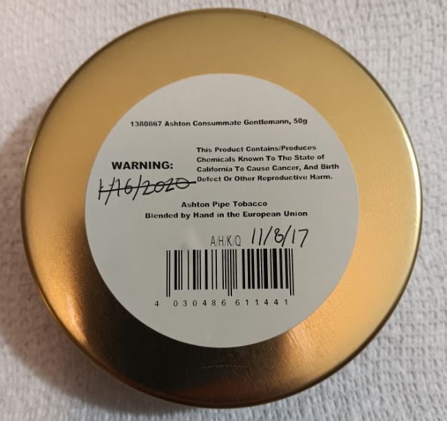 A 50g tin of Ashton's Consummate Gentleman tinned in November 2017. An English blend with over 6 years of age. No reserve.