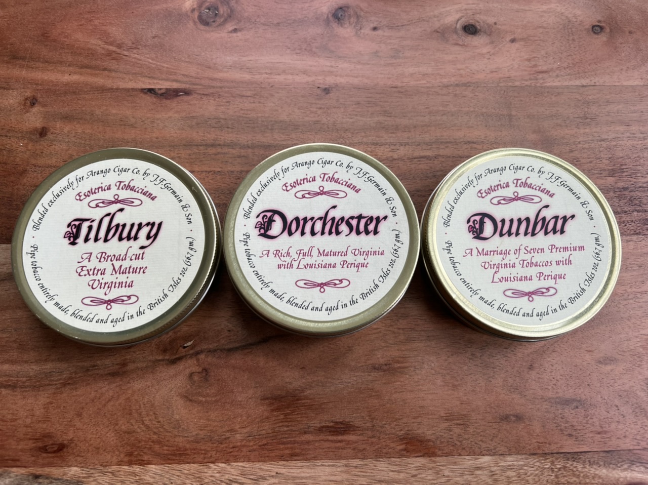 1 sealed tin each of Esoterica Dunbar, Dorchester, and Tilbury. Purchased in 2020.