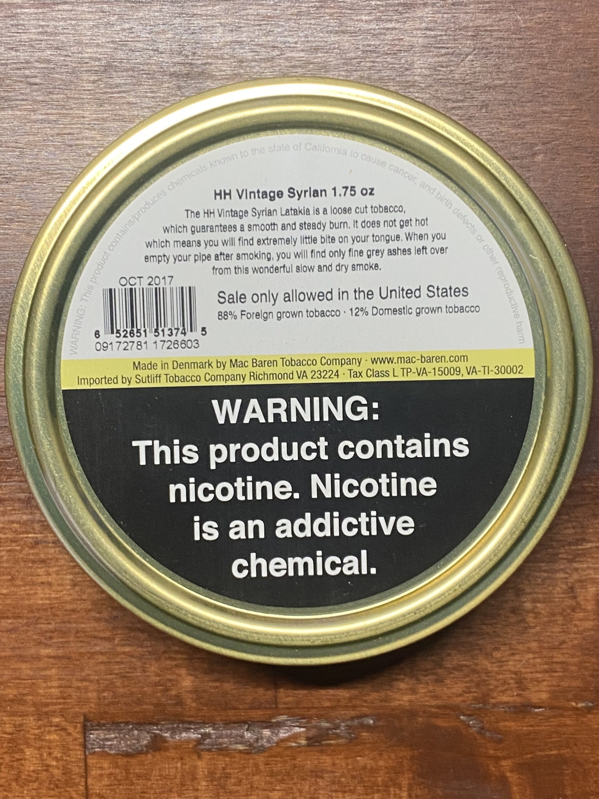 Notes: Introduced in 2006 as HH Vintage Syrian Latakia. Discontinued in 2017 when the stock of Syrian latakia ran out.