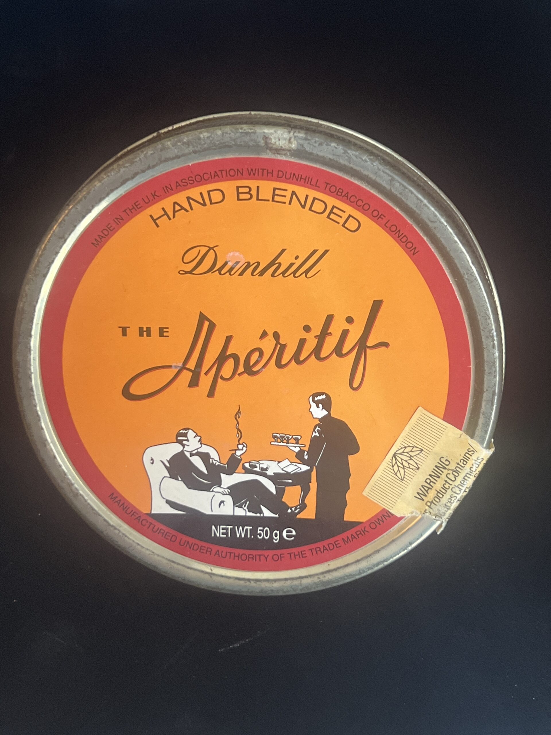 Dunhill Aperitif 50g 1995. Hand blended at the London Store. Very rare!! Tin shows some signs of age and has a dent in the bottom but is still sealed and has the original sticker over the lid to the Tin. A complex blend of Virginias, cavendish, Latakia and Oriental Leaf. The name 'Aperitif' suggests this well balanced medium mixture should be enjoyed prior to dinner. Tin has been well preserved and stored in a humidor.