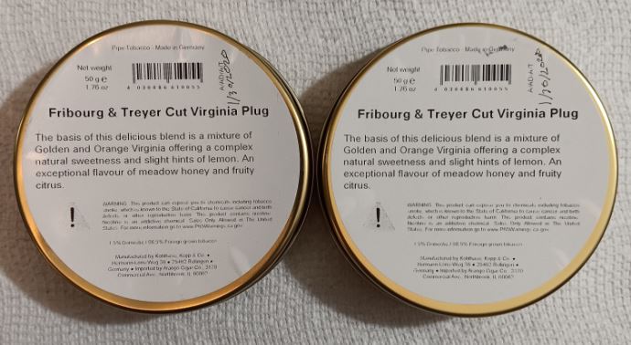 2 tins of Cut Virginia Plug tinned January 30, 2020. Difficult to find in stock. A straight Virginia blend with 4 years of age.