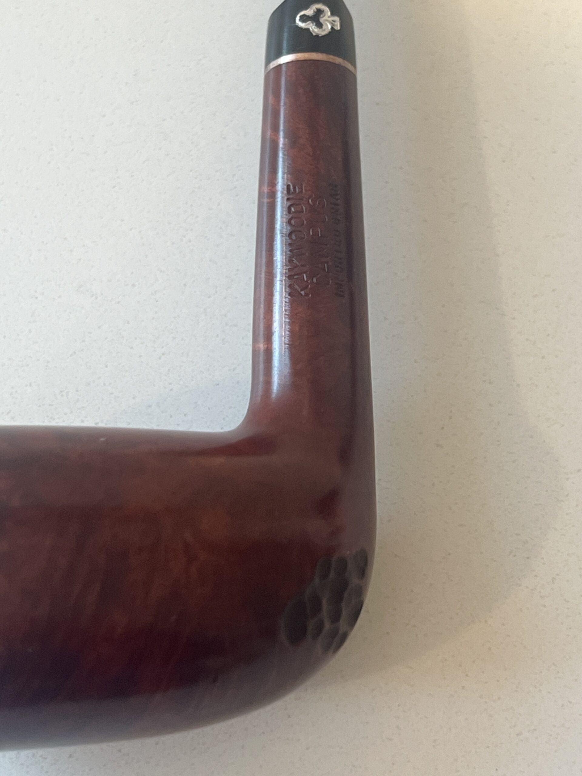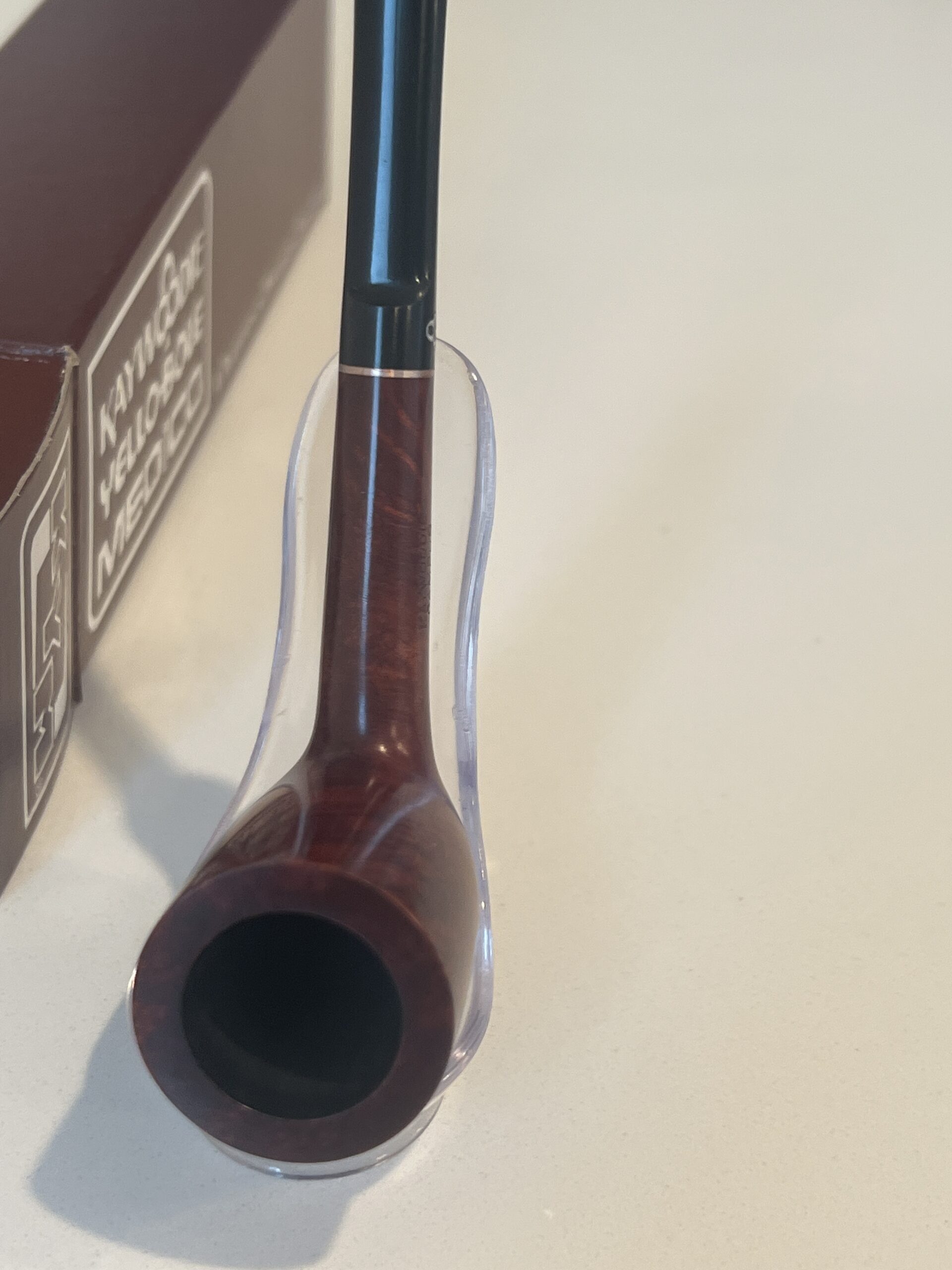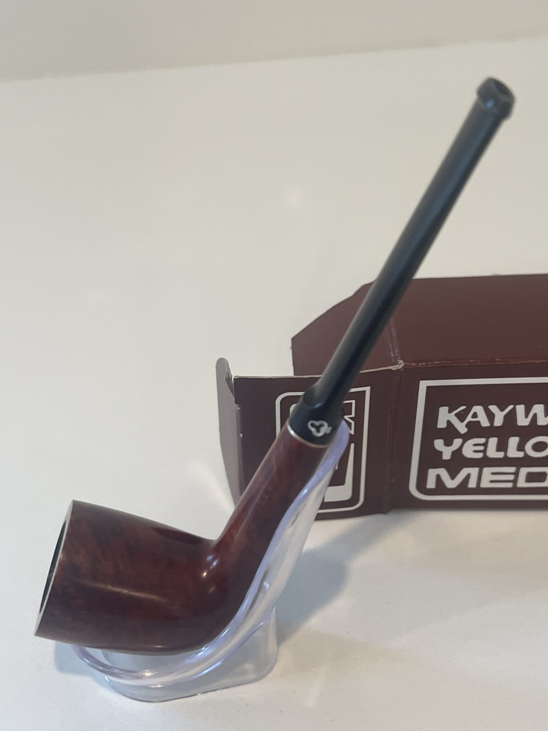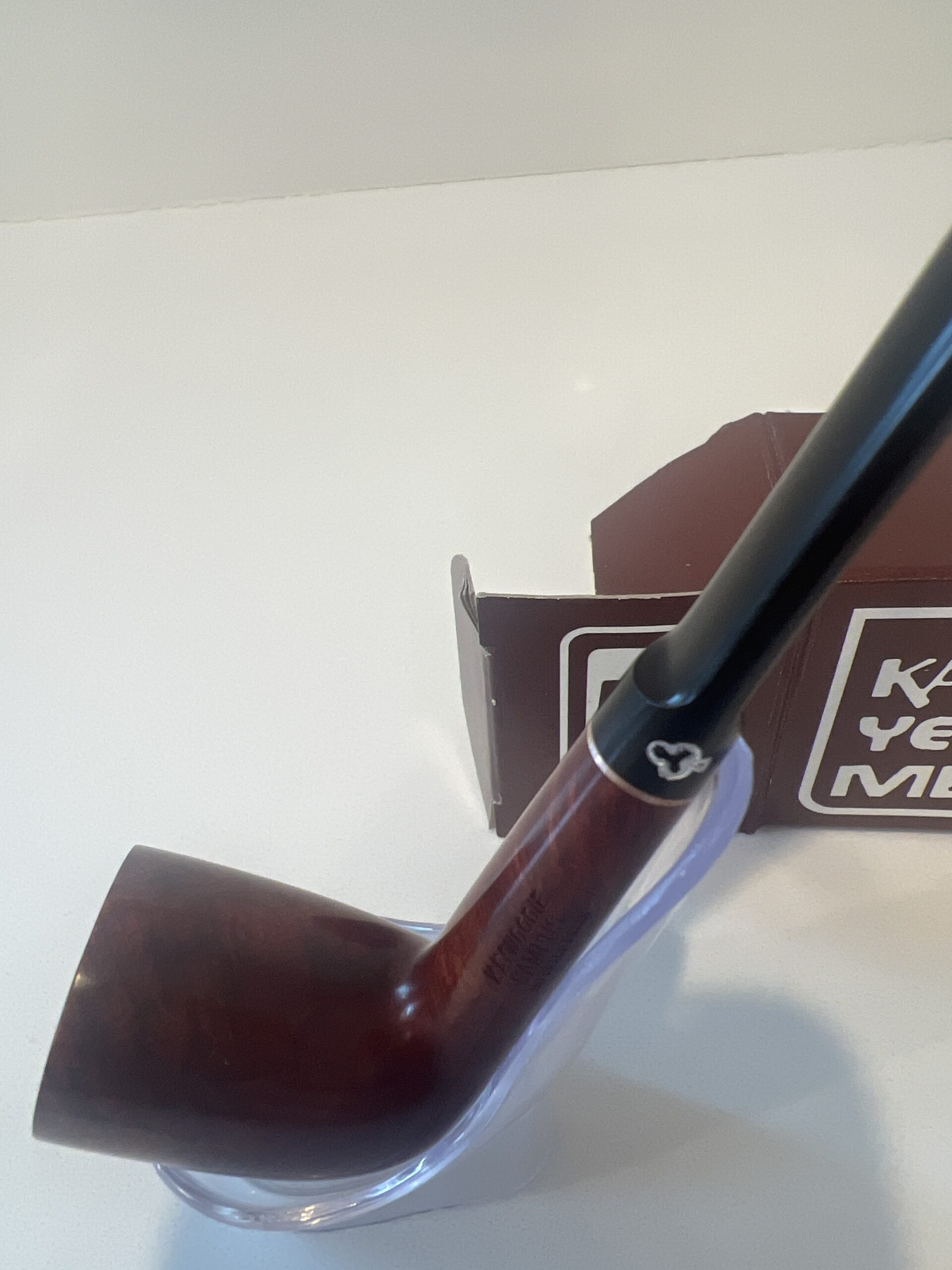 Non smoked Dublin saddle bit straight with accent gold on stem. Imported briar.