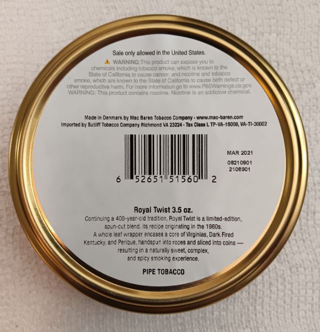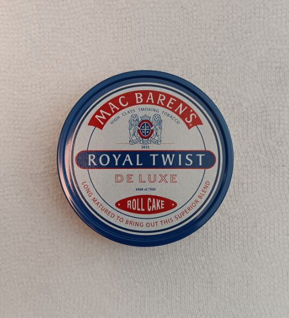 A 100g tin of Mac Baren's limited release Royal Twist Deluxe tinned in March 2021. This is from the first release of the blend. A Virginia/Perique/Kentucky blend with 3 years of age. Tin 6968 of 7500.