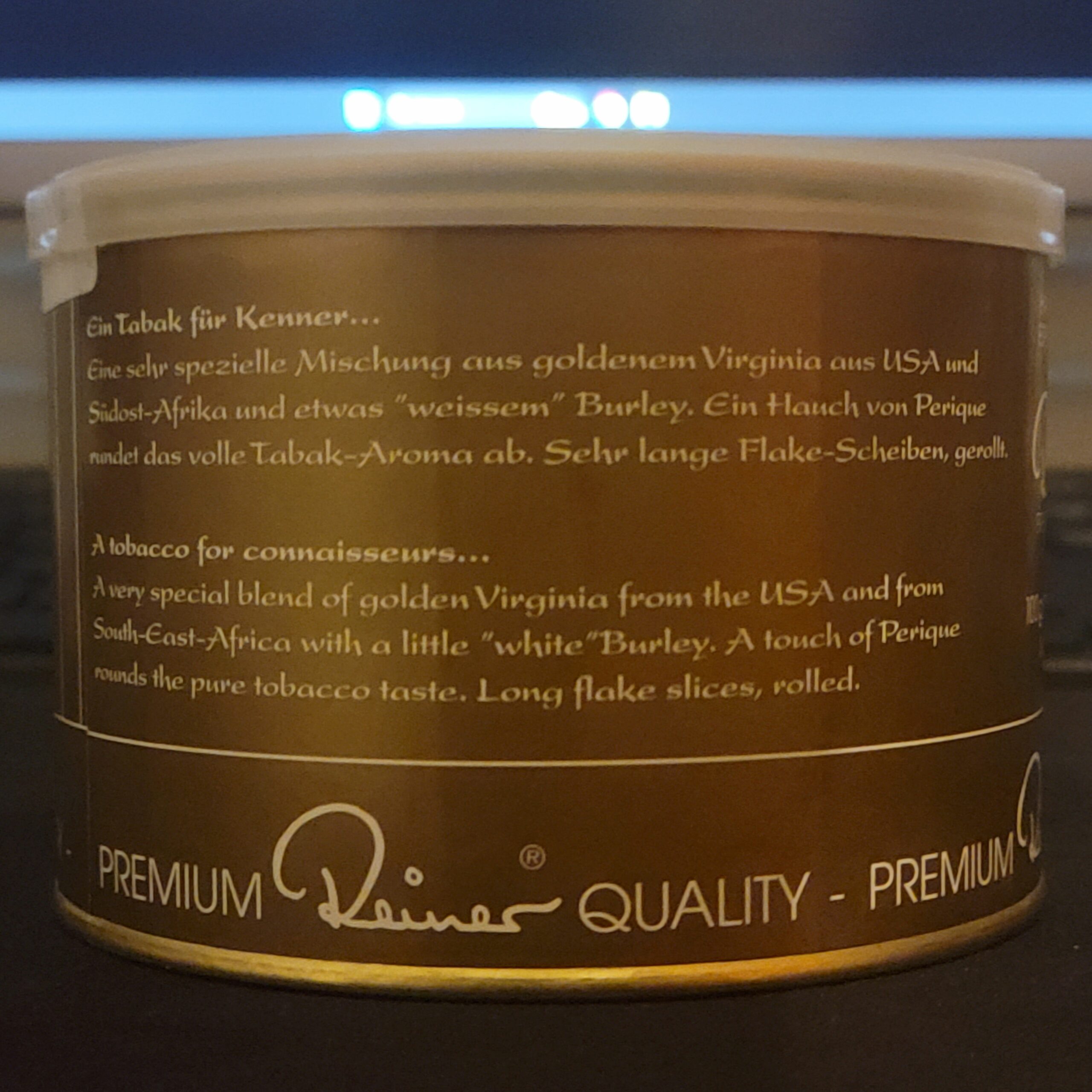 A very special blend of golden Virginias from the USA and from South-East-Africa with a little of "white" Burley. A touch of Perique rounds the pure tobacco taste. Long flake slices, rolled.