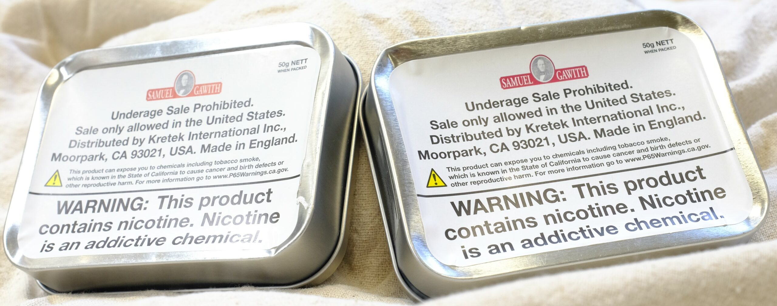 This auction is a lot of 2 Gawith Commonwealth tins. These are from 2021. The rear of the tins are a little dinged up, but the seal is fine on the tins.