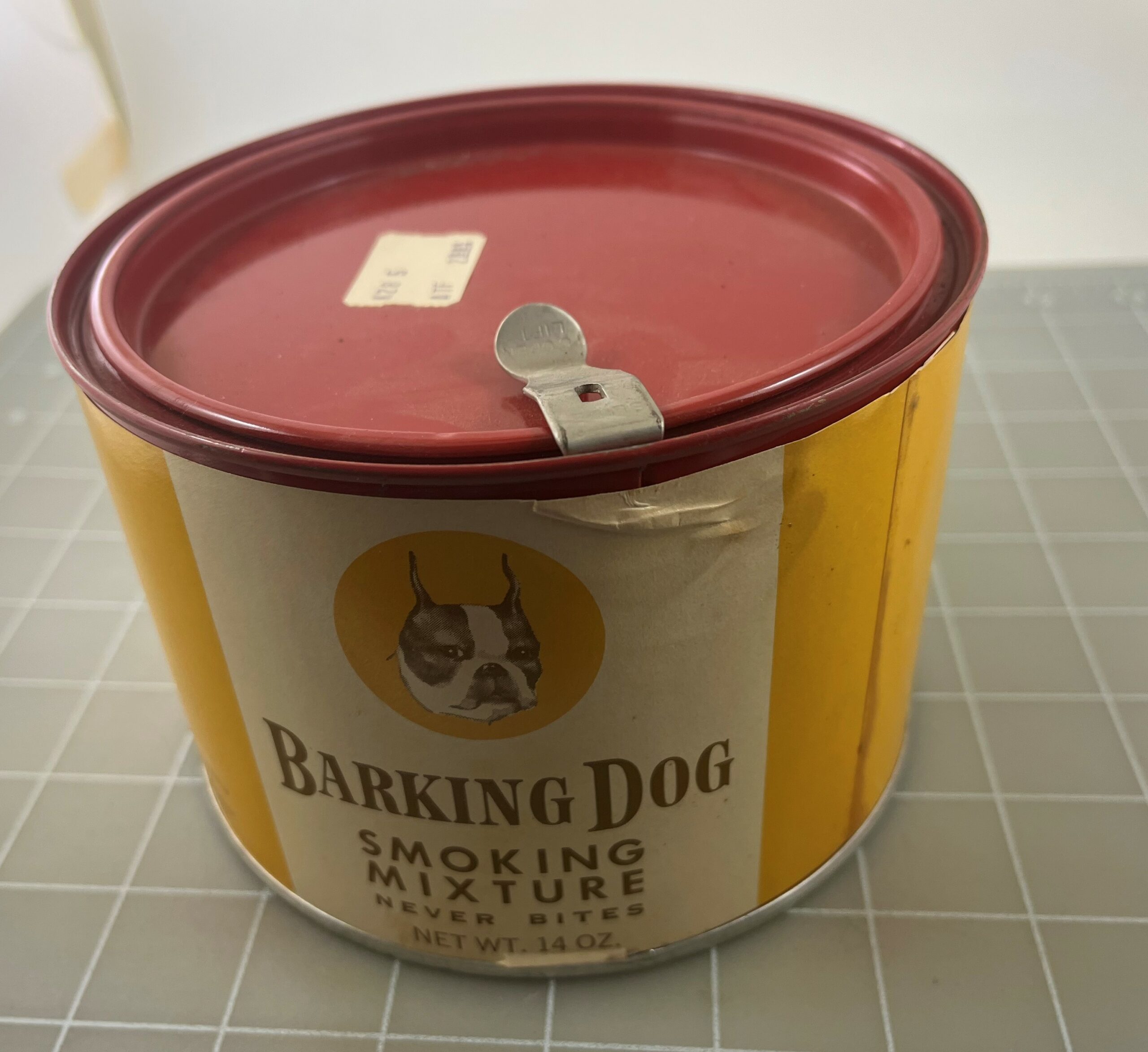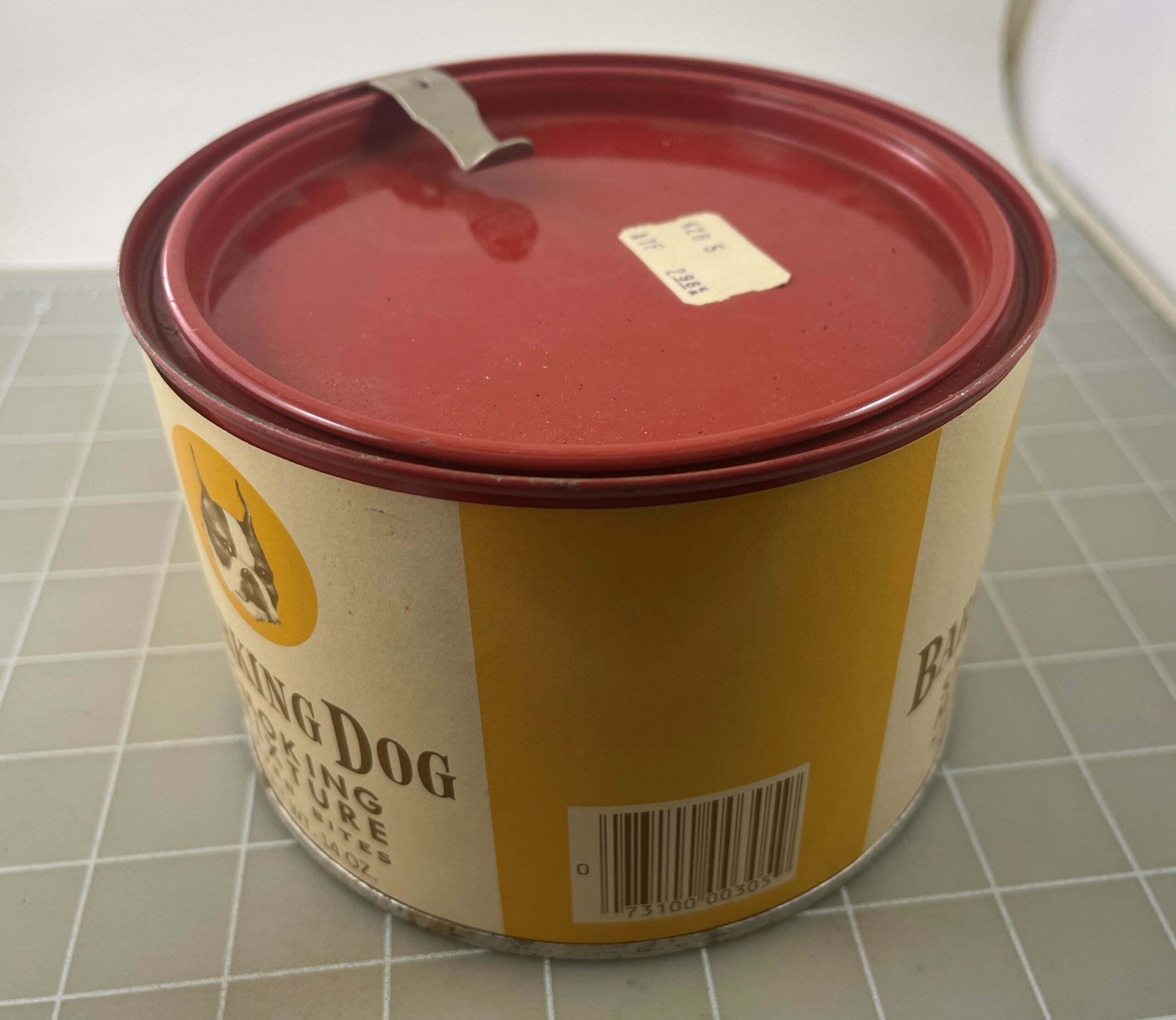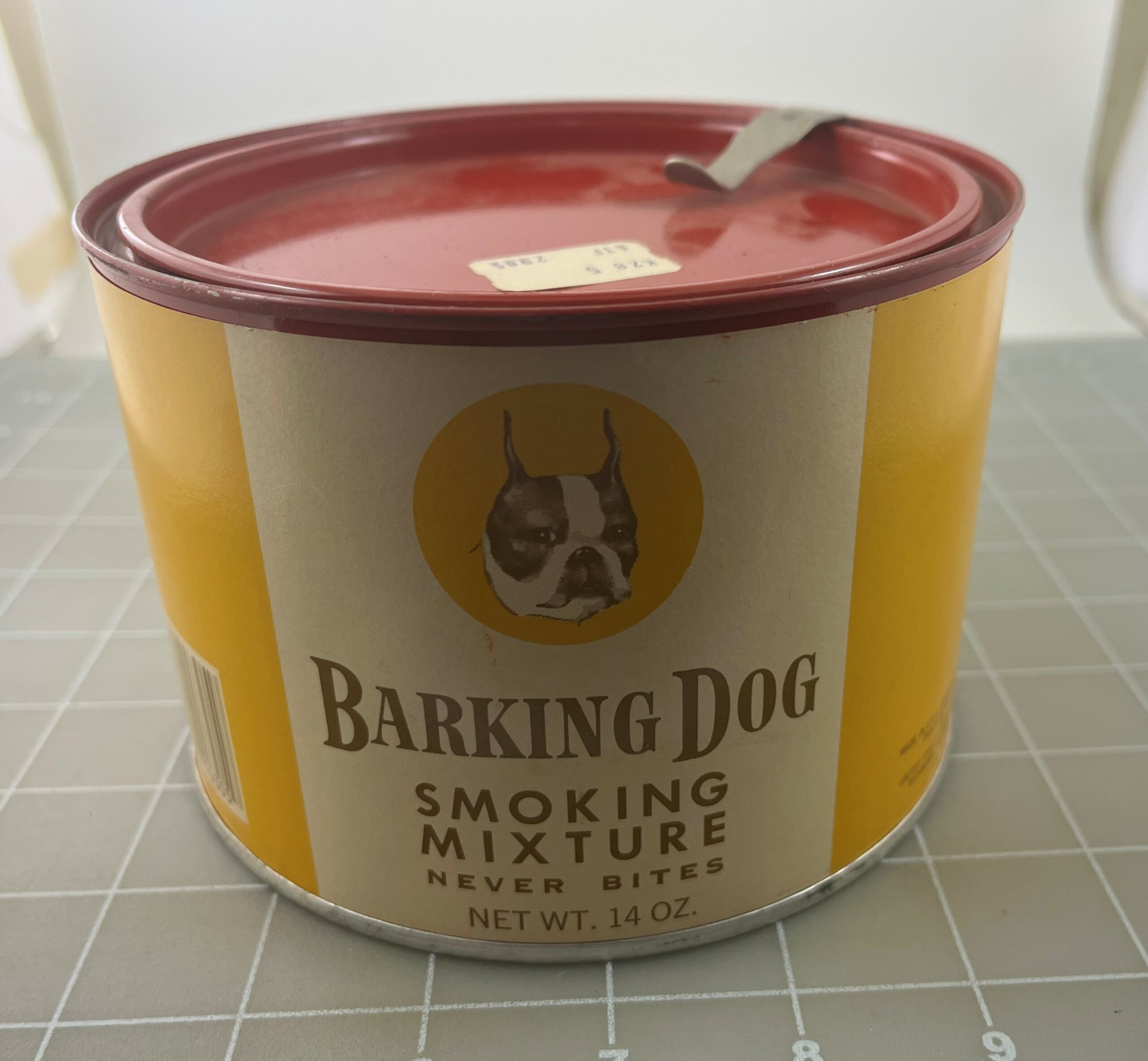 (Ended) Vintage Sealed 14 oz Barking Dog Smoking Mixture Never Bites Tin