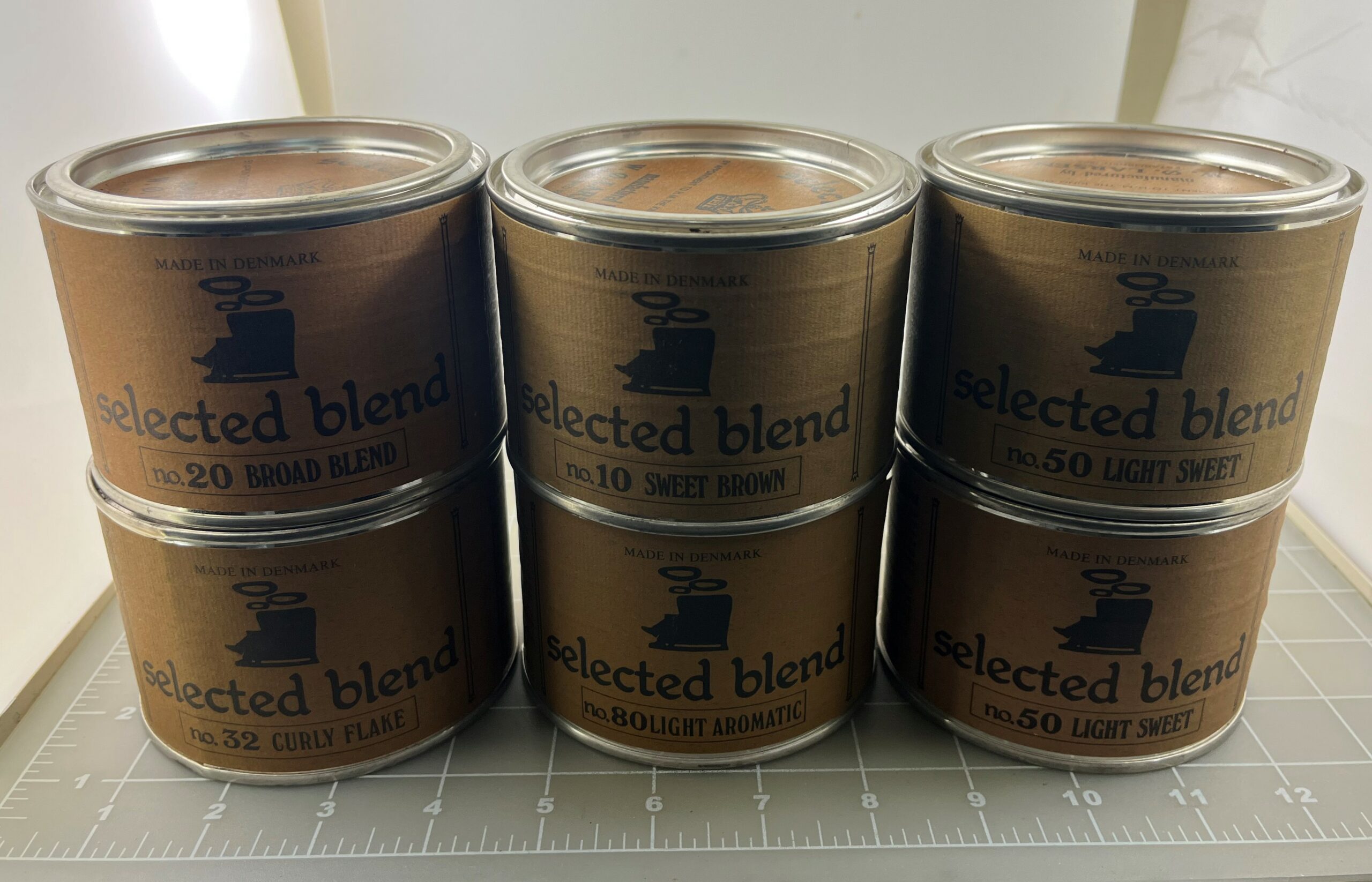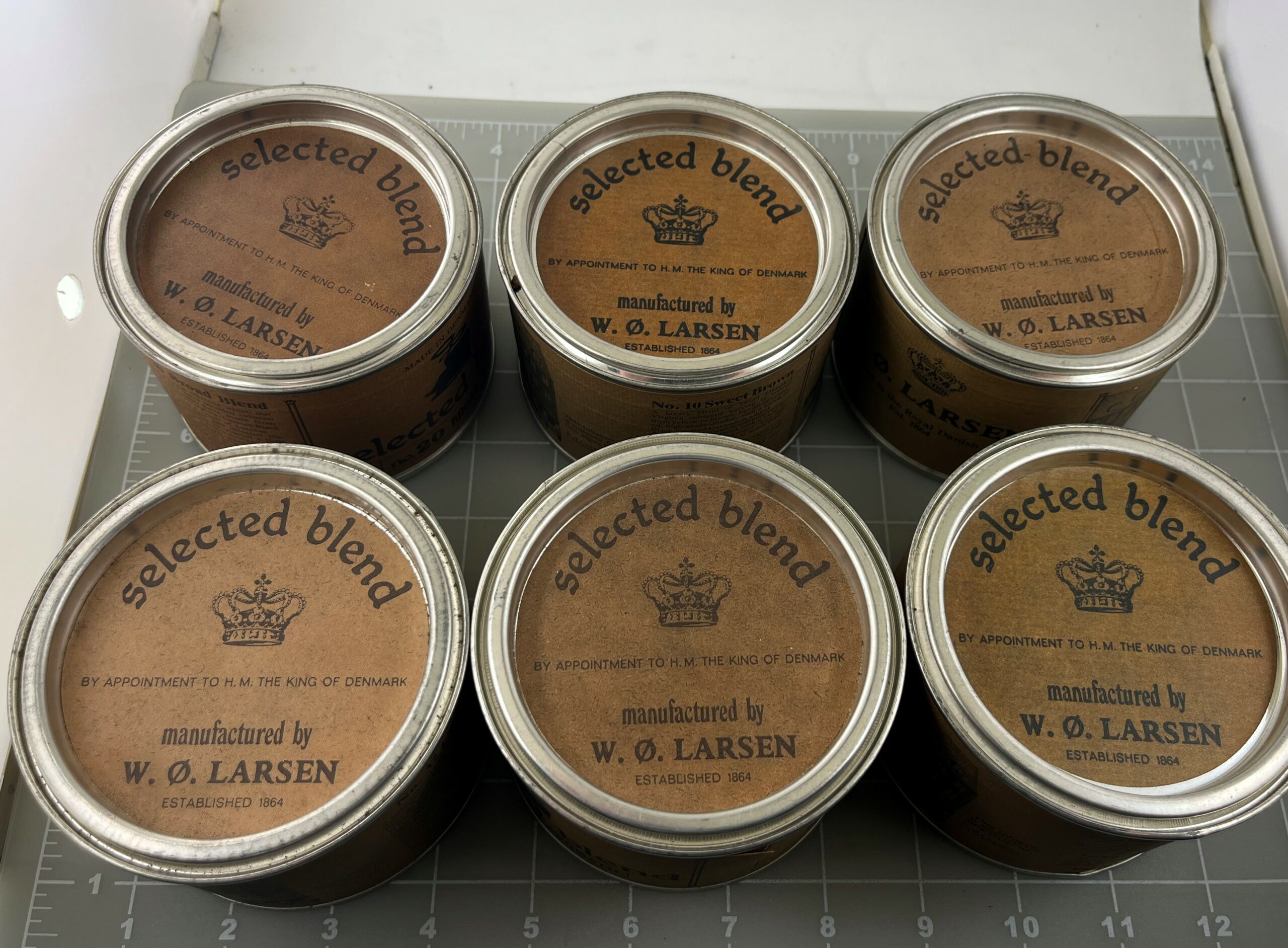Lot of 6 Vintage W.O. Larsen Selected Blends Sealed 3.5 oz. Tins. Blends No. 20, 10, 32, 80, & 2 50.