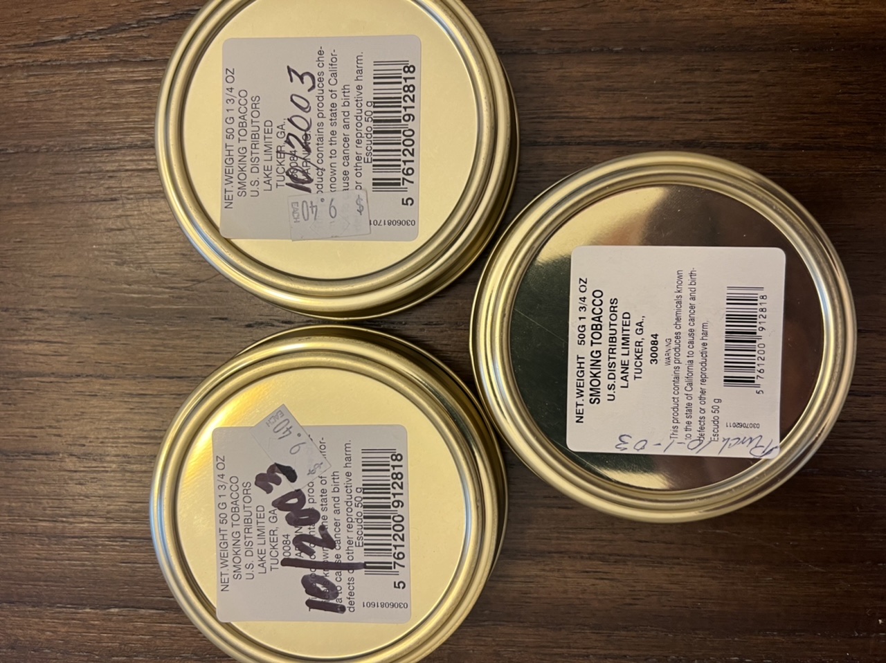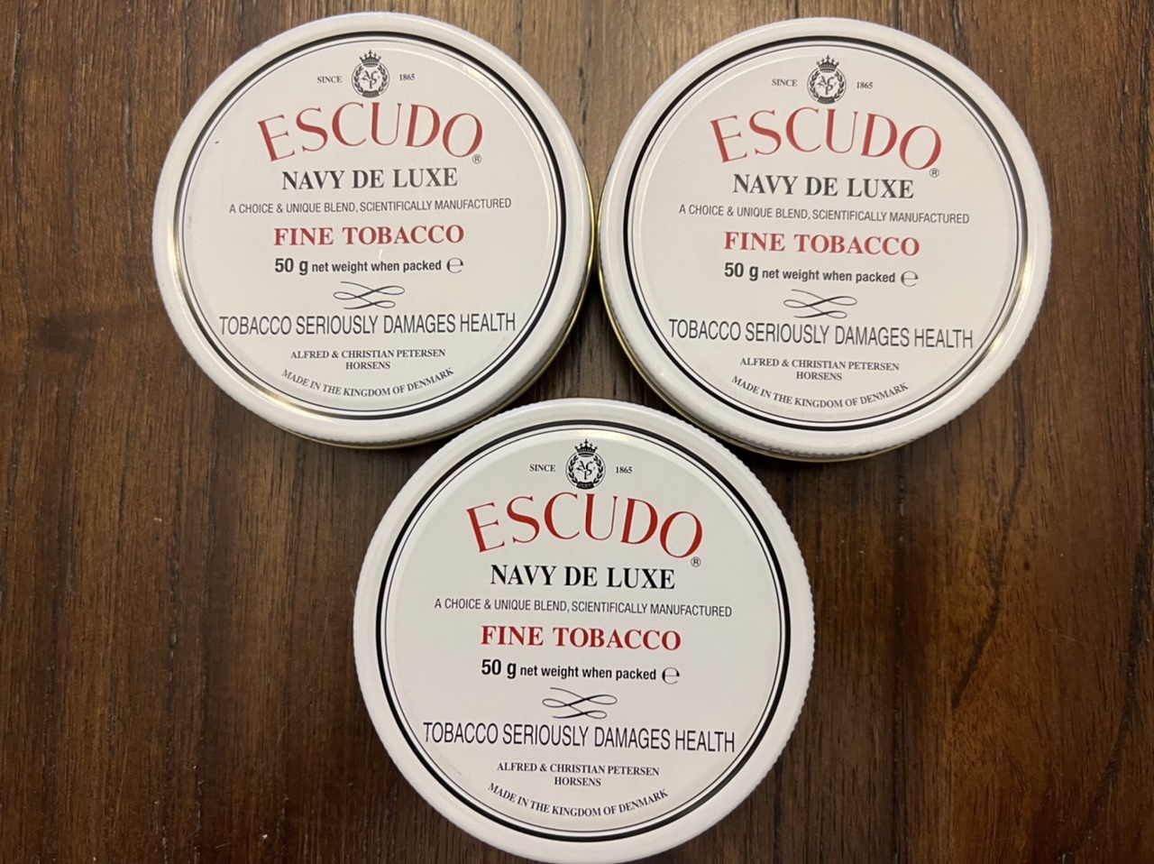 This auction is for Three (3) 2003 A&C Petersen ESCUDO Navy De Luxe 50g Painted Label Tins.