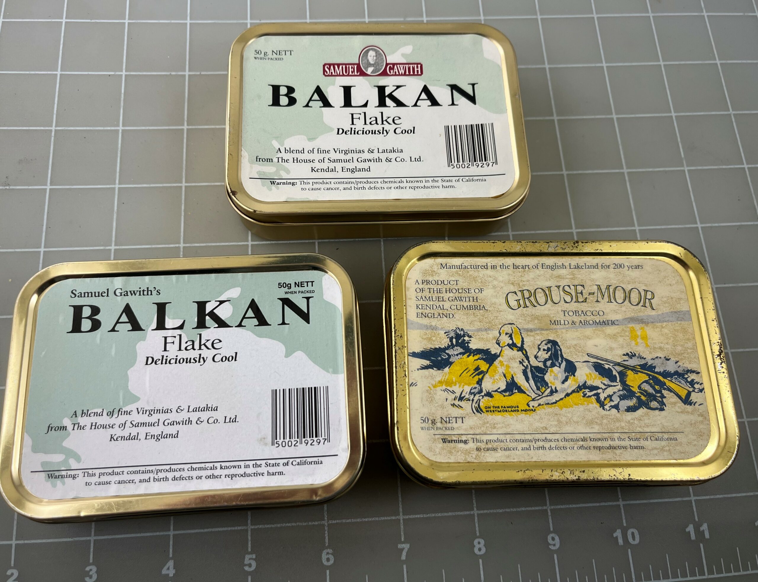 Lot of 3 Sealed Samuel Gawith's 50 Gram Tins Grouse-Moor & 2 Balkan Flake. Very Nice Sealed Condition