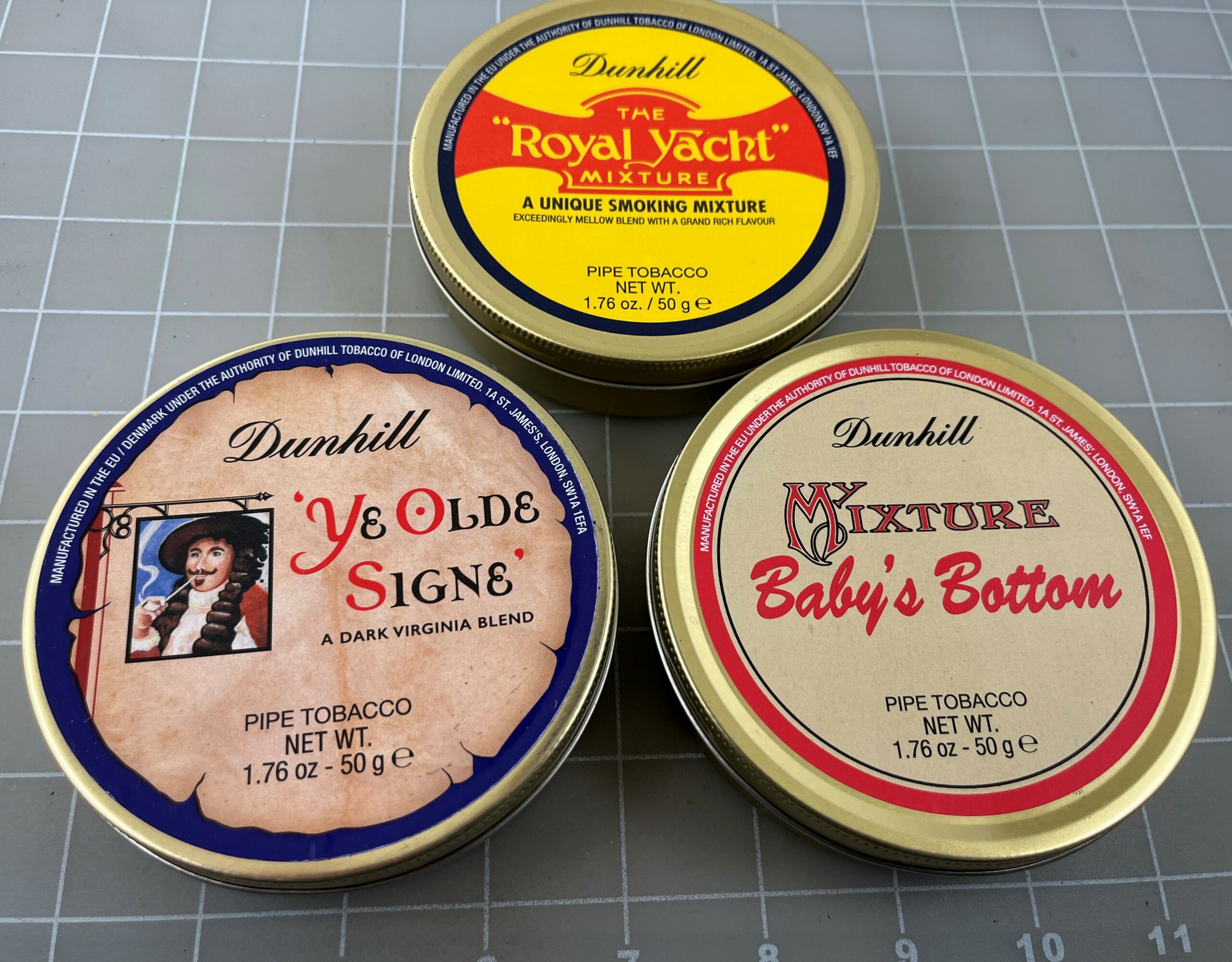 Lot of 3 Sealed Dunhill 50 Gram Tins - Baby's Bottom, Ye Olde Signe, & Royal Yacht. All tins are in Excellent sealed condition.
