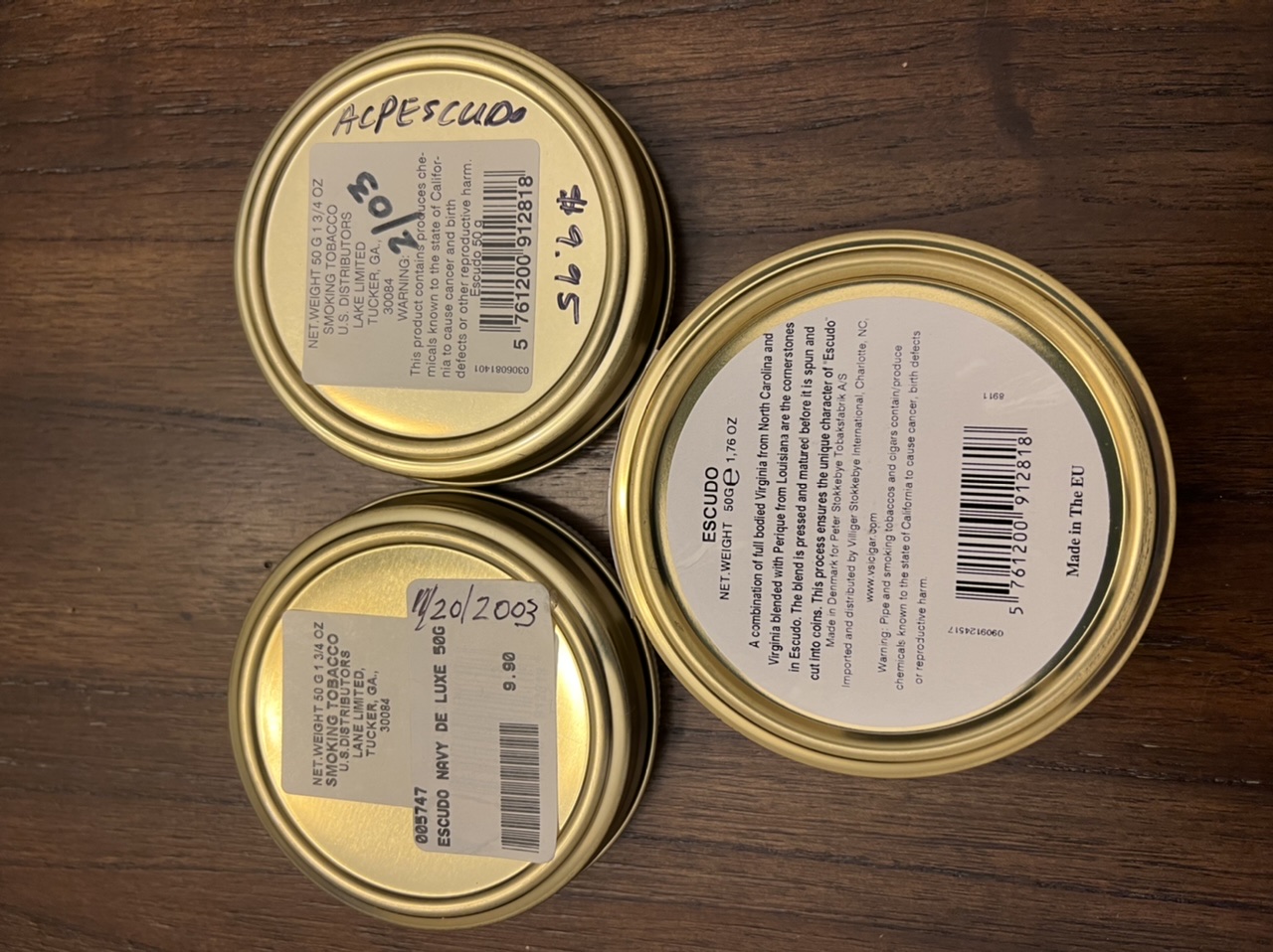This auction is for Two (2) 2003 A&C Petersen ESCUDO Navy De Luxe 50g Painted Label Tins and One (1) 2009 STG ESCUDO Navy De Luxe Tin.