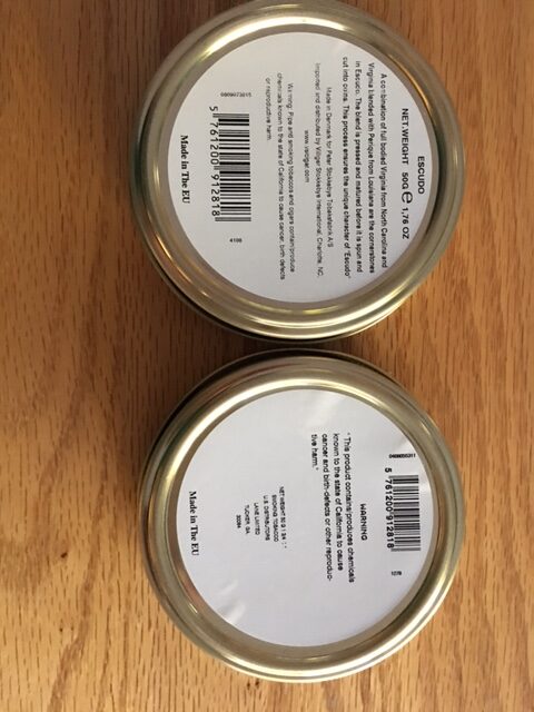 Two 50g tins from different distributors. One was a Lane Limited distribution, and the other was made for Peter Stokkebye A/S and imported and distributed by Villiger Stokkebye International. The Lane Limited one has lettering around the outer top rim.