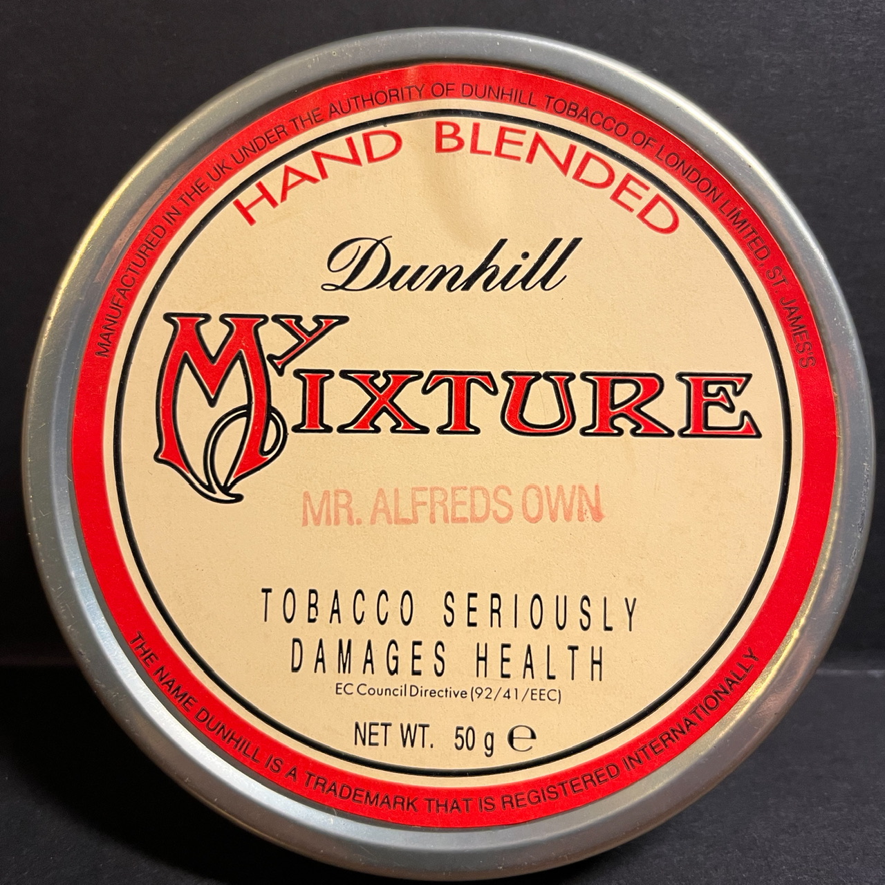 A well-aged, 50g tin of Dunhill Mr. Alfred’s Own which contains Cavendish, cigar leaf, Latakia, Oriental, and Virginia. Tin has light shake, seal appears intact.