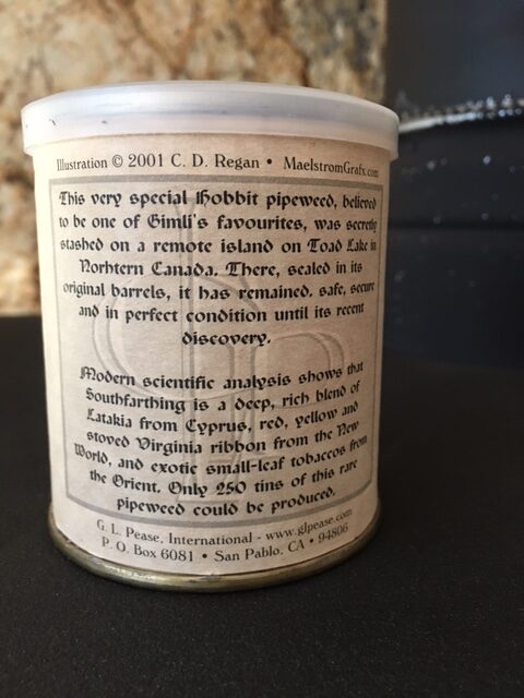 2oz tin. Hobbit themed. GL Pease limited production of 250 tins and offered only at the 2001 NASPC Pipe and Tobacco Show.