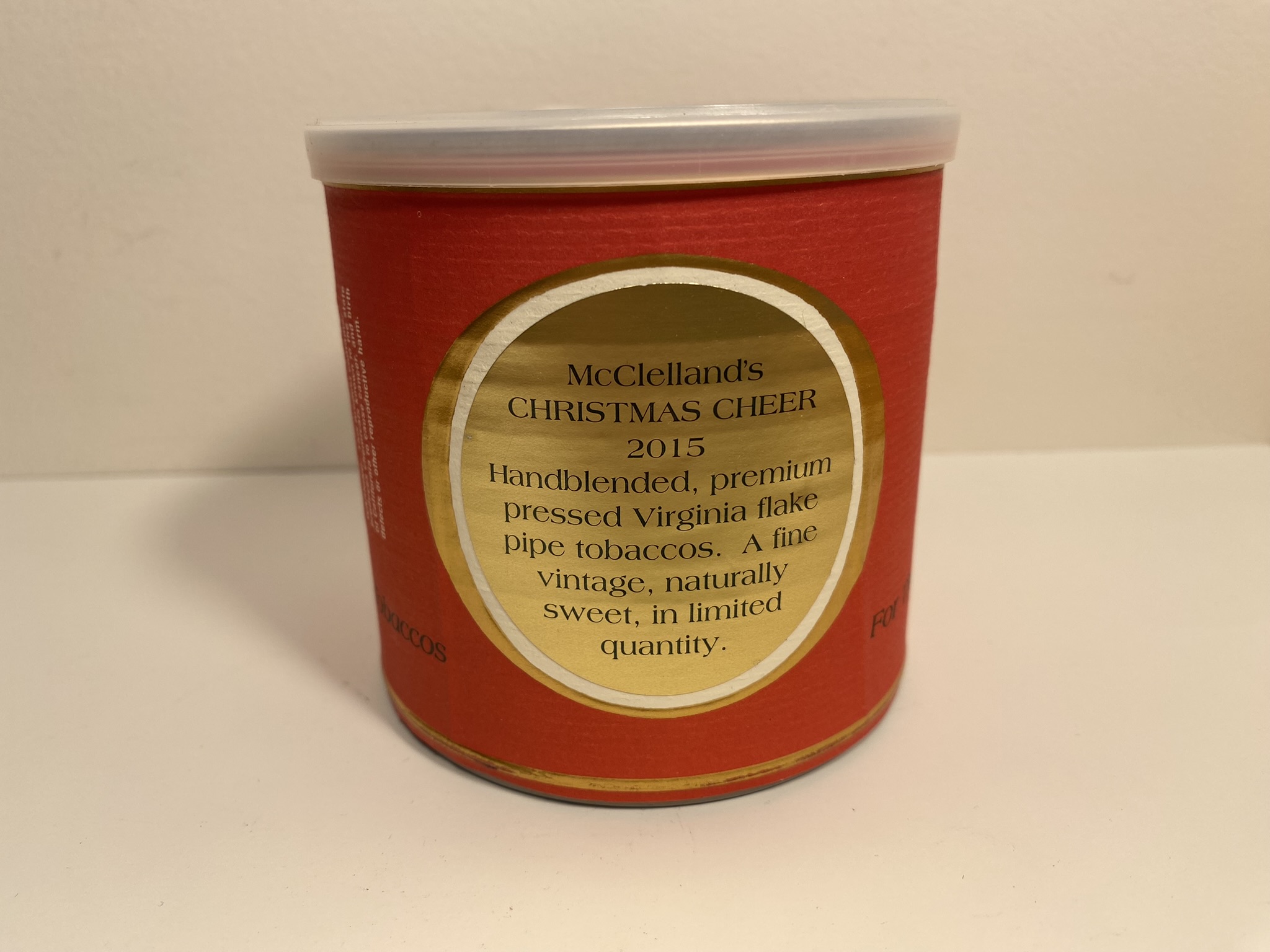 Notes: From tin insert: We are proud to offer our 2015 Christmas Cheer pipe tobacco, an exceptionally fine vintage tobacco, hand blended and aged in pressed cakes to develop natural mellowness. This 2015 blend is made with a special selection of rich, ripe, flue-cured Virginia from an outstanding 2011 Old-Belt crop. Superb leaf picked at peak ripeness, it is naturally sweet, rich in oils. It should age with distinction. Each buying season, we look for tobaccos of exceptionally quality and distinctive character. In various combinations, their flavors, aromas, textures contribute to the overall excellence of all our products.