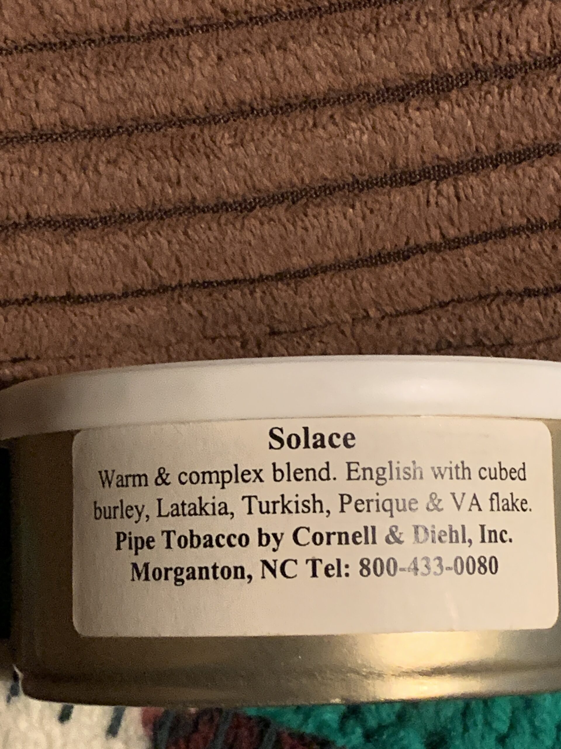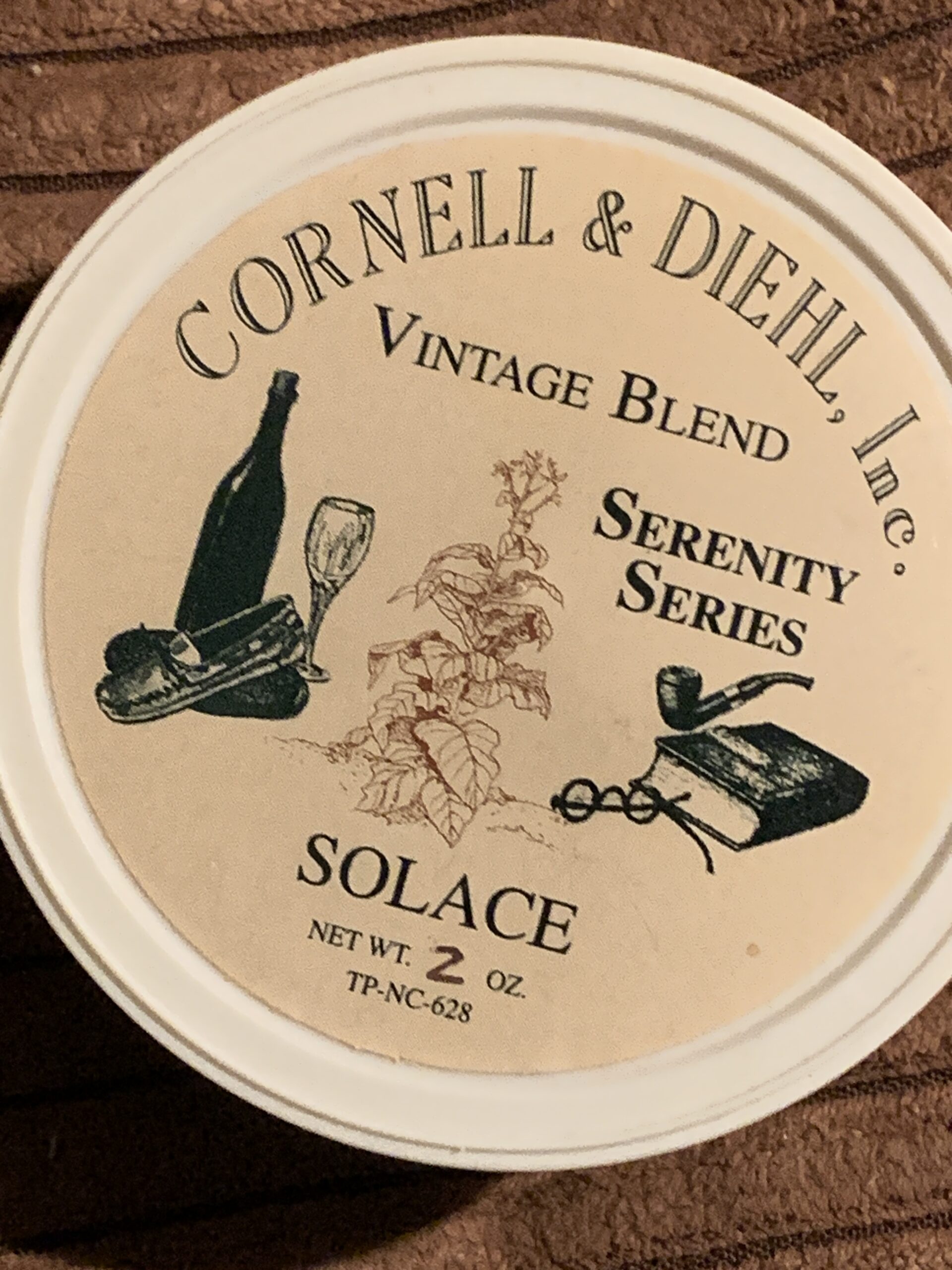 06/02/2003. Warm and complex blend. English with cubed burley, Latakia, Turkish, Perique and Virginia flake. Serenity Series Solace