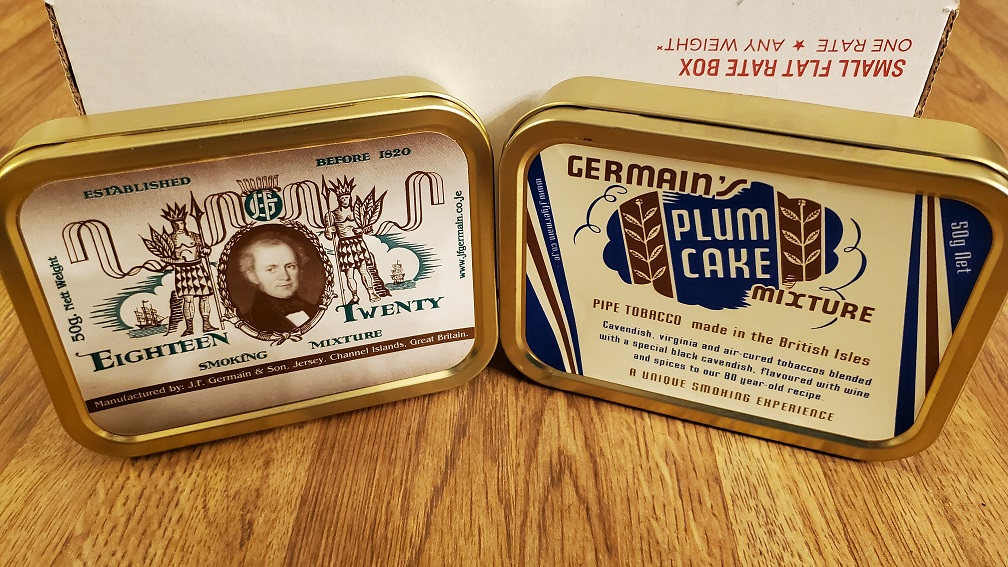 Germain's Plum Cake - Cavendish, virginia and air-cured tobacco blended with a special black cavendish. Flavoured with wine and spices. Tin dated 3/2015