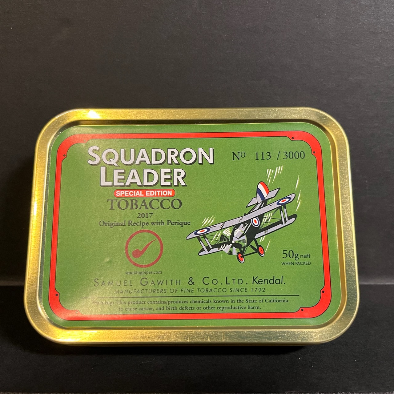 Smoking Pipes limited edition run of Samuel Gawith Squadron Leader with Perique. Tin has no shake and seal appears intact.