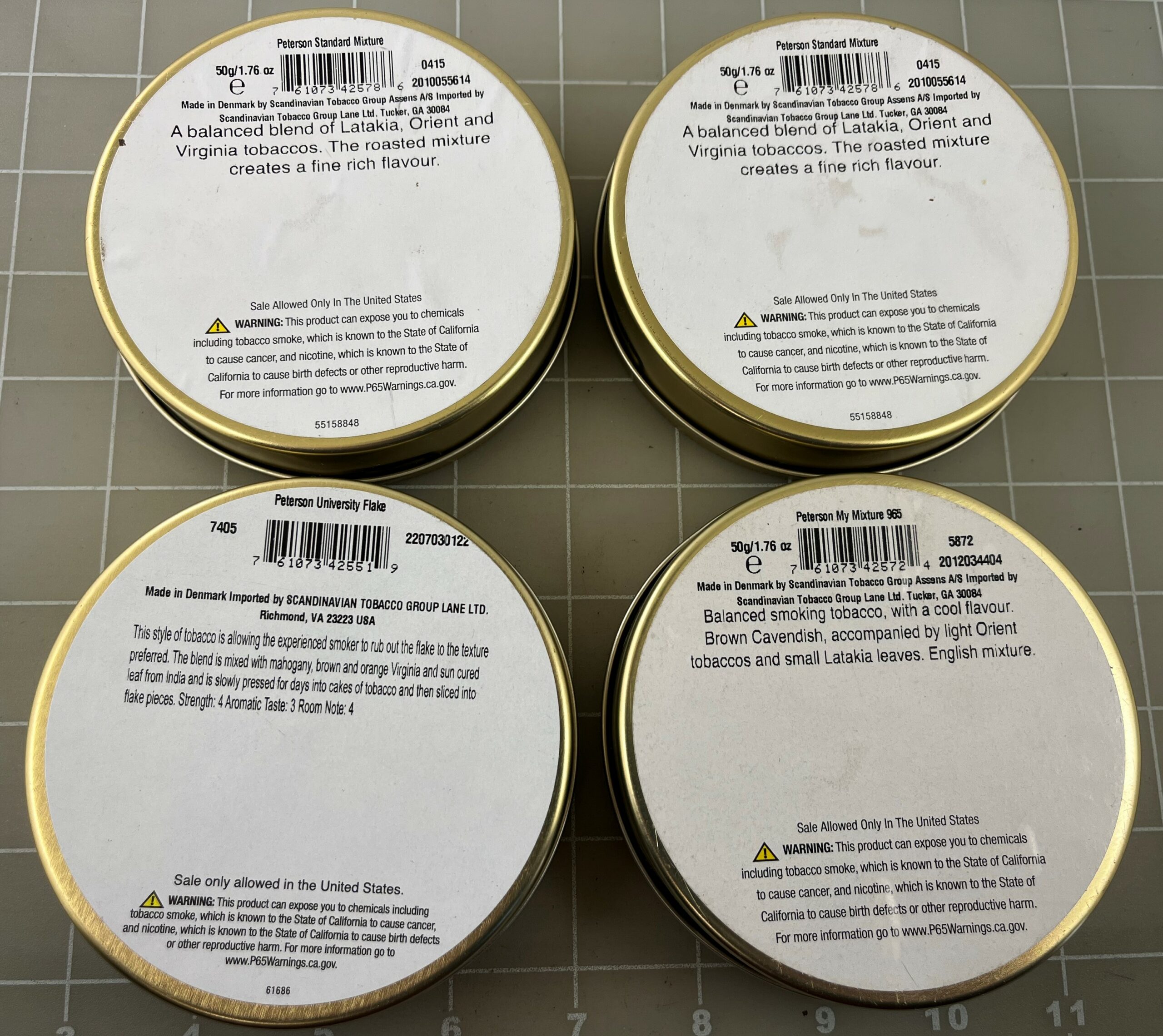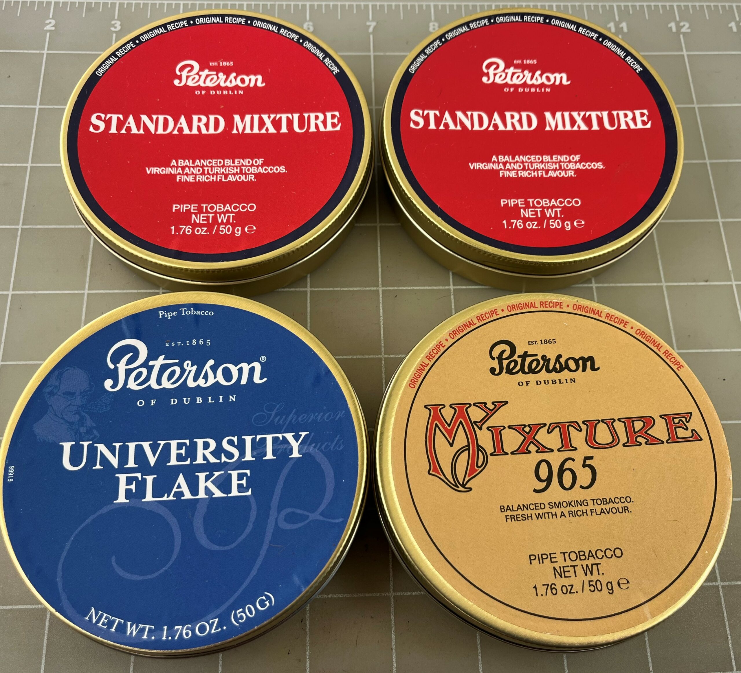 Lot of 4 Sealed Peterson 50 Gram Tobacco Tins. 965 Mixture, 2 Standard Mixture, & University Flake. Excellent Sealed Condition.