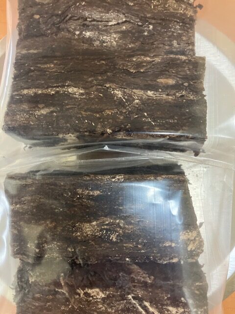 Observe the plume on these 13 year old plugs! This 8oz in the Jar was unopened since 2012 with thirteen years in the (airconditioned) cellar. described in tobacco reviews: "A blend of dark fired Virginias and Indian fire-cured with a casing of distinctive aromatics presented straight from the press in a plug.". Highly rated.