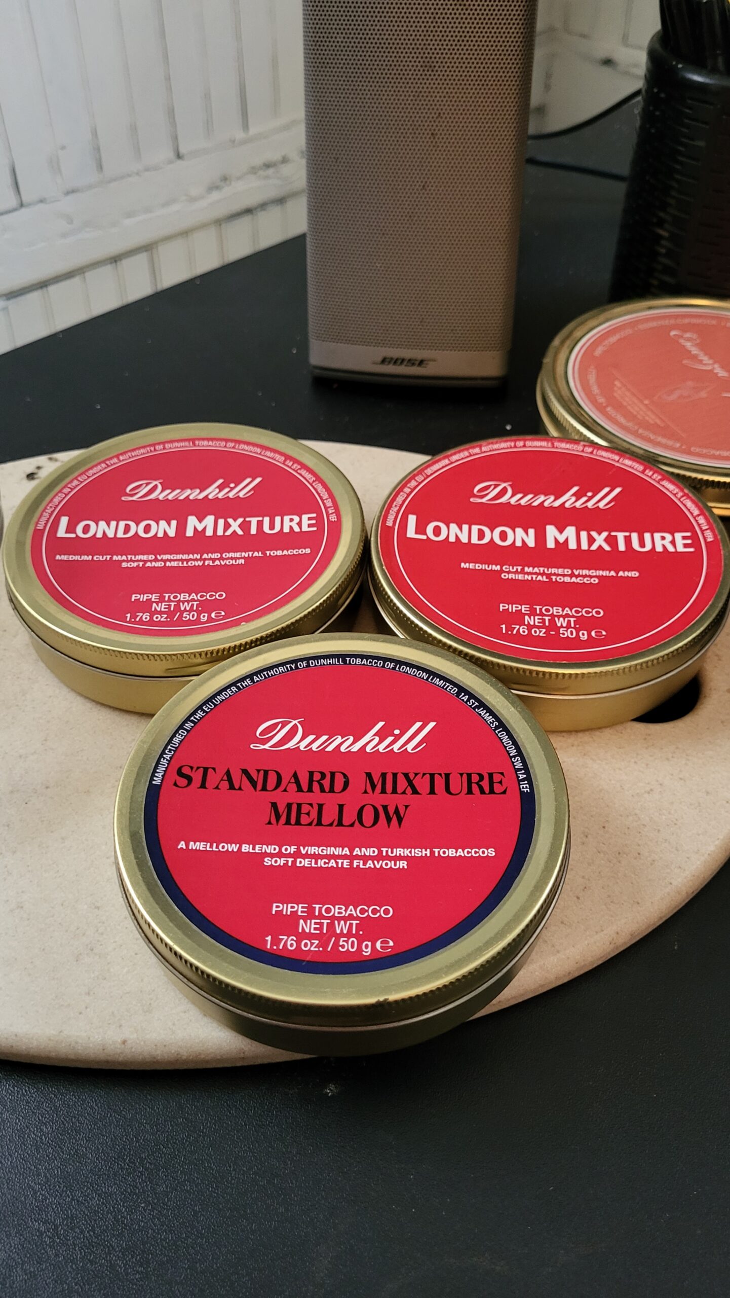 Out-of-production Dunhill tins. Enjoy some well-aged tobacco. I have been smoking these London mixtures I bought at an estate sale. They are too good to keep to myself.