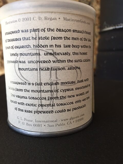 2oz tin. Hobbit themed. GL Pease limited production of 400 tins and offered only at the 2003 NASPC Pipe and Tobacco show.