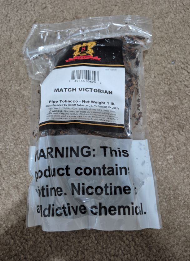 A sealed 1 pound bag of Sutliff Match Victorian. Purchased sometime in the past 3 years. This blend is out of production. A Virginia/Perique blend. This was designed as a match for the old Dunhill Elizabethan mixture.
